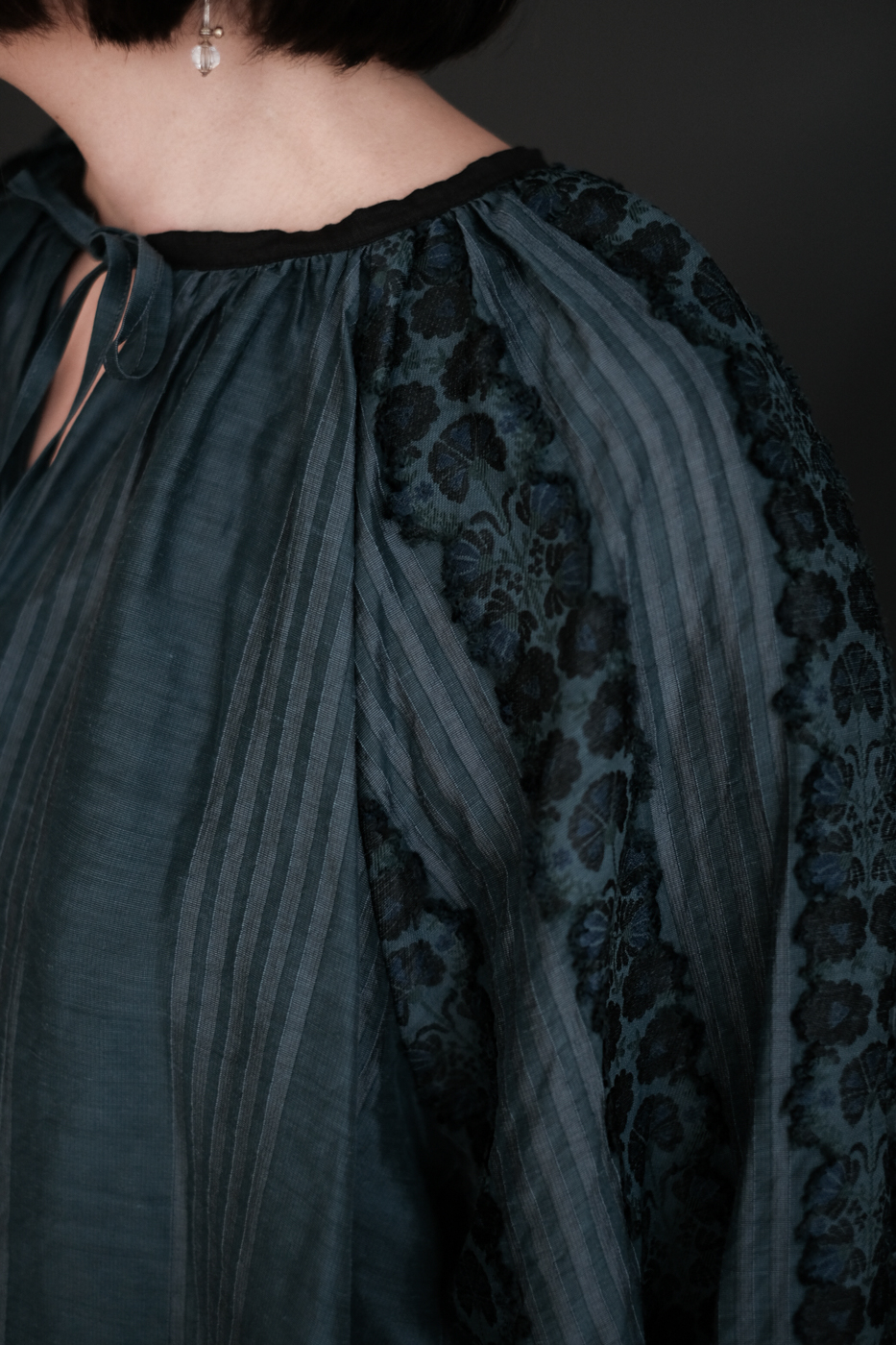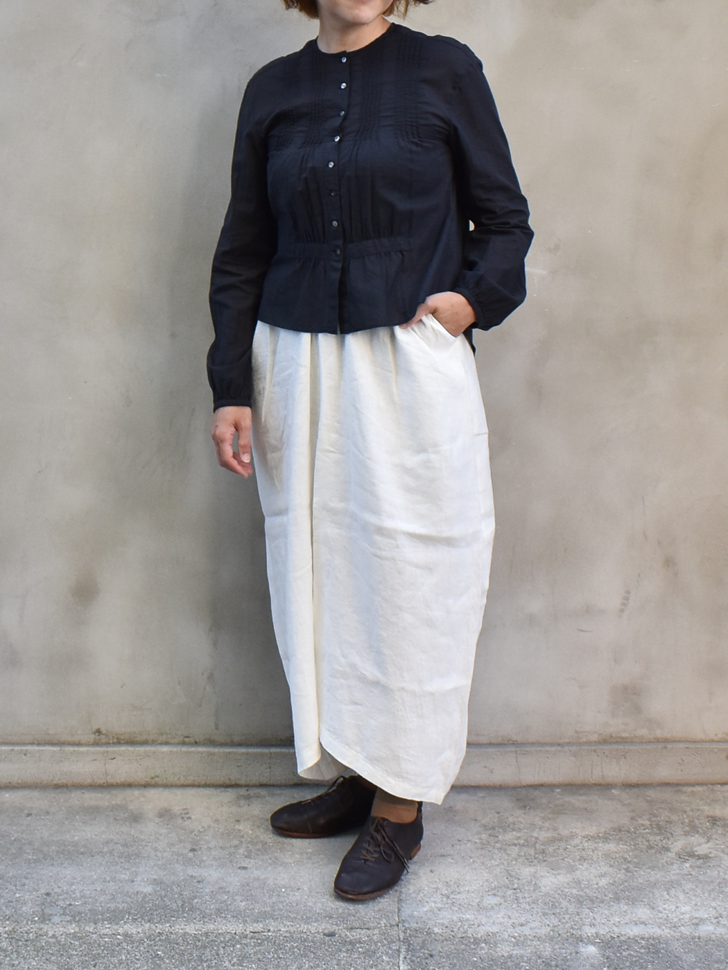 胸元、首元に細かいピンタックが施されており、