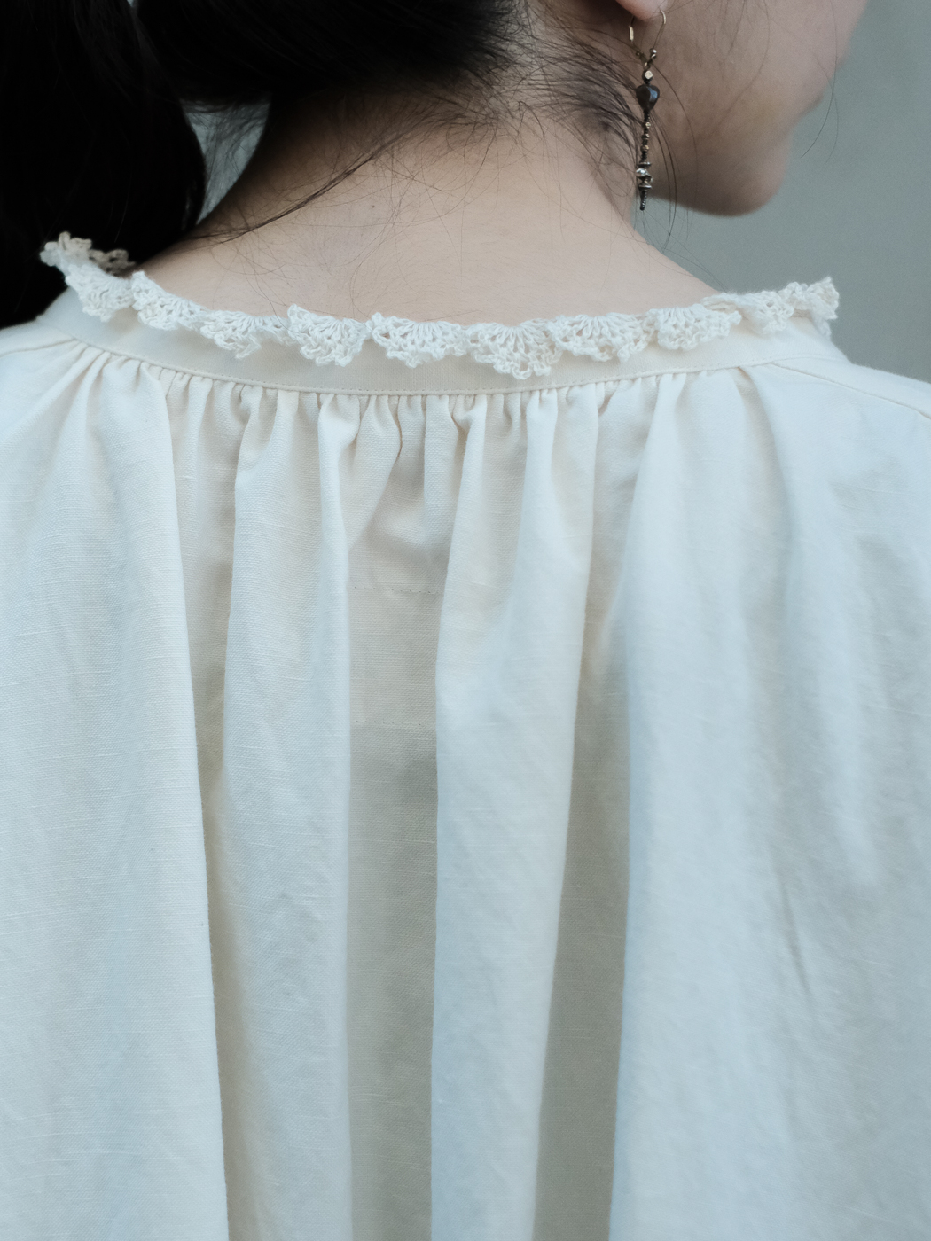 襟ぐりにかぎ針レースが施してあります。