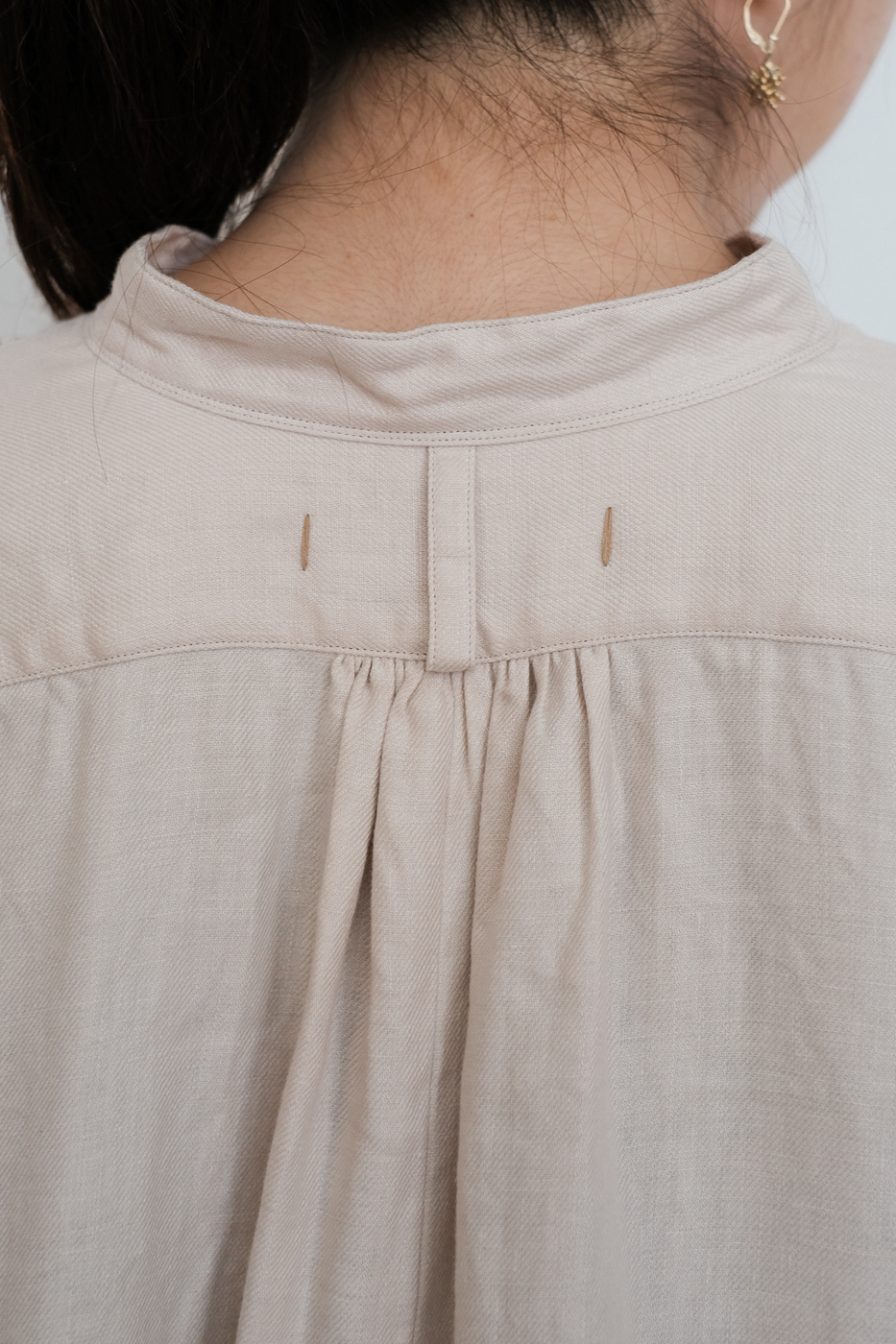 ノーカラーの首元に、前後差のある着丈、