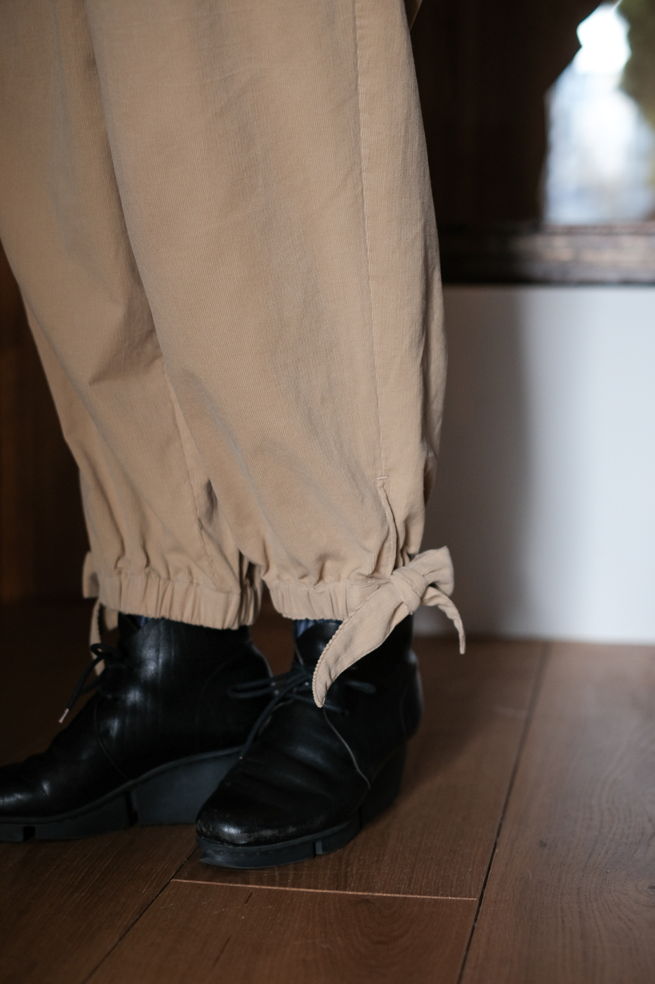 ウエストにタックが施され、裾はゴムに、