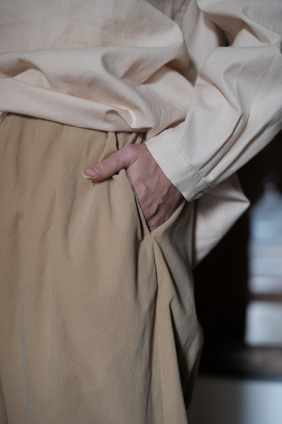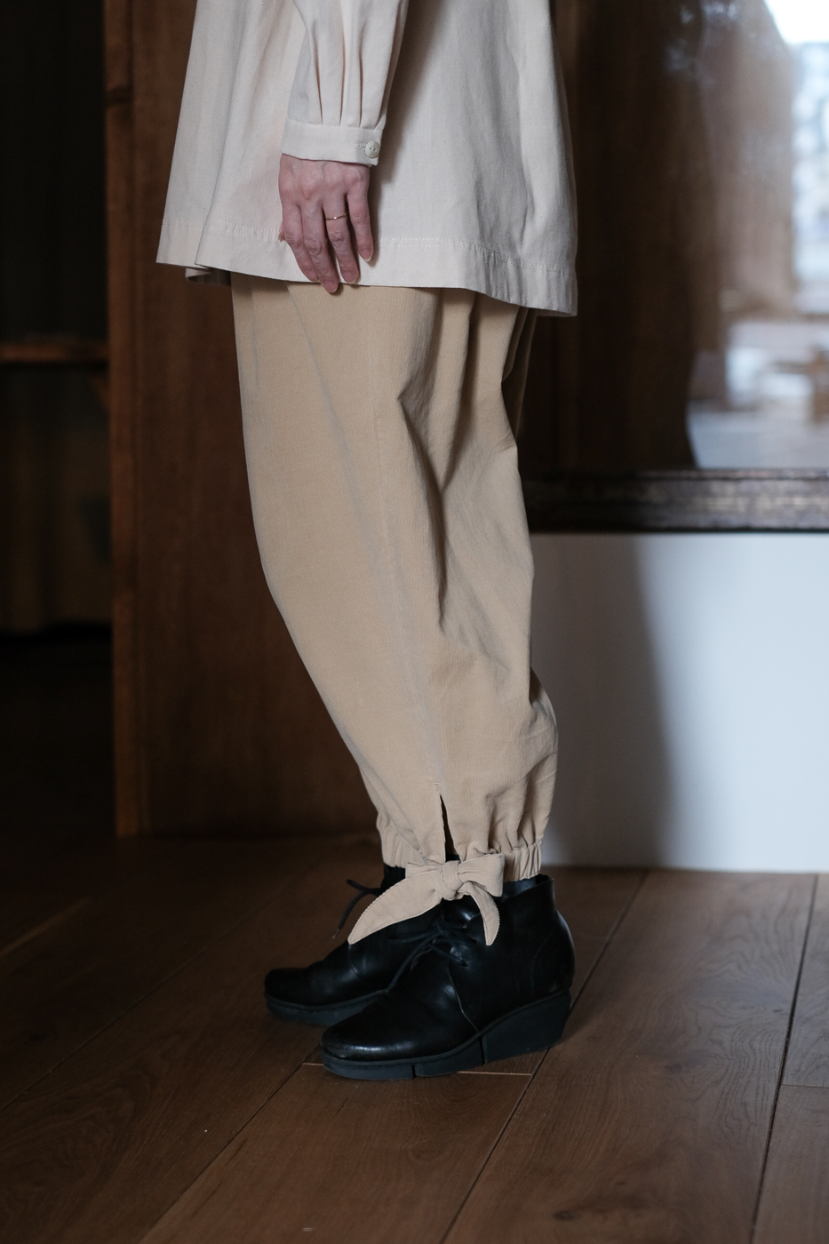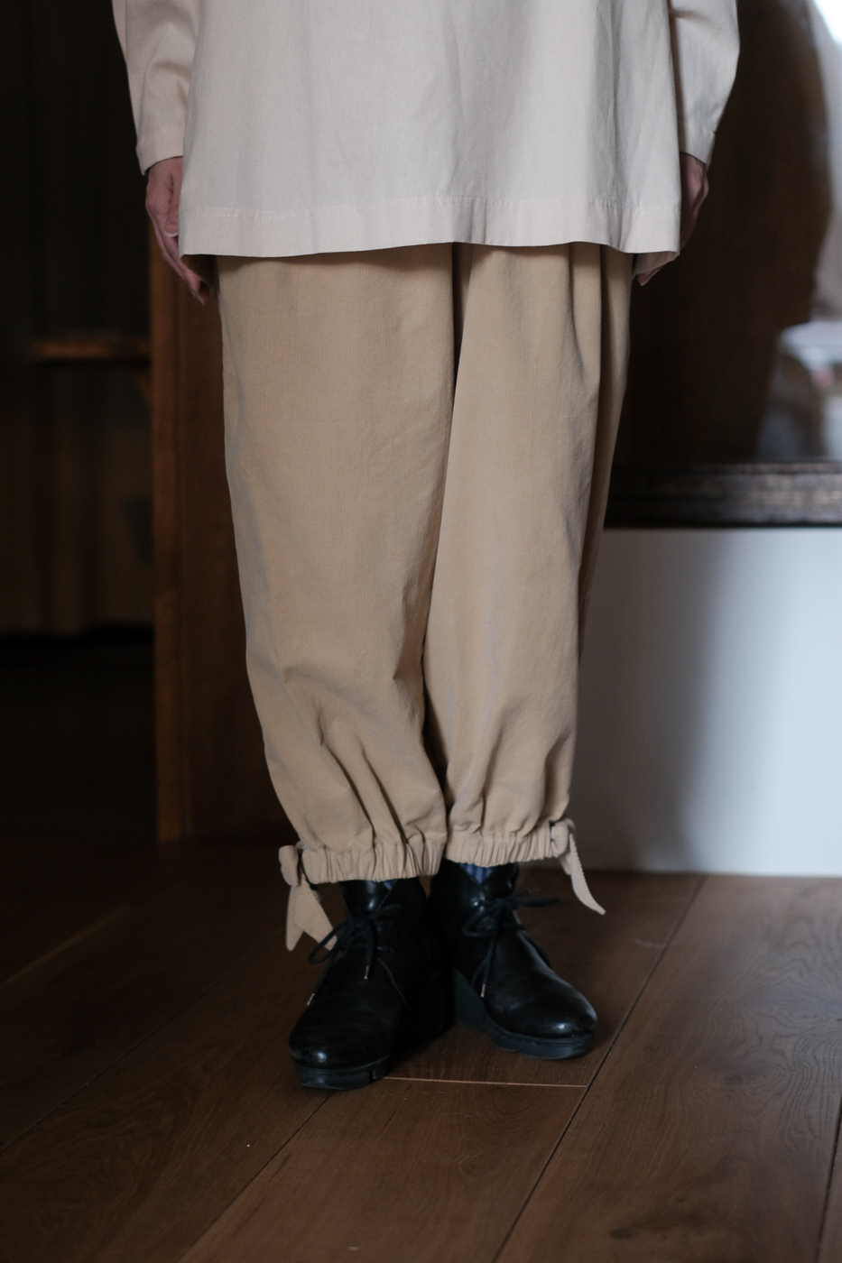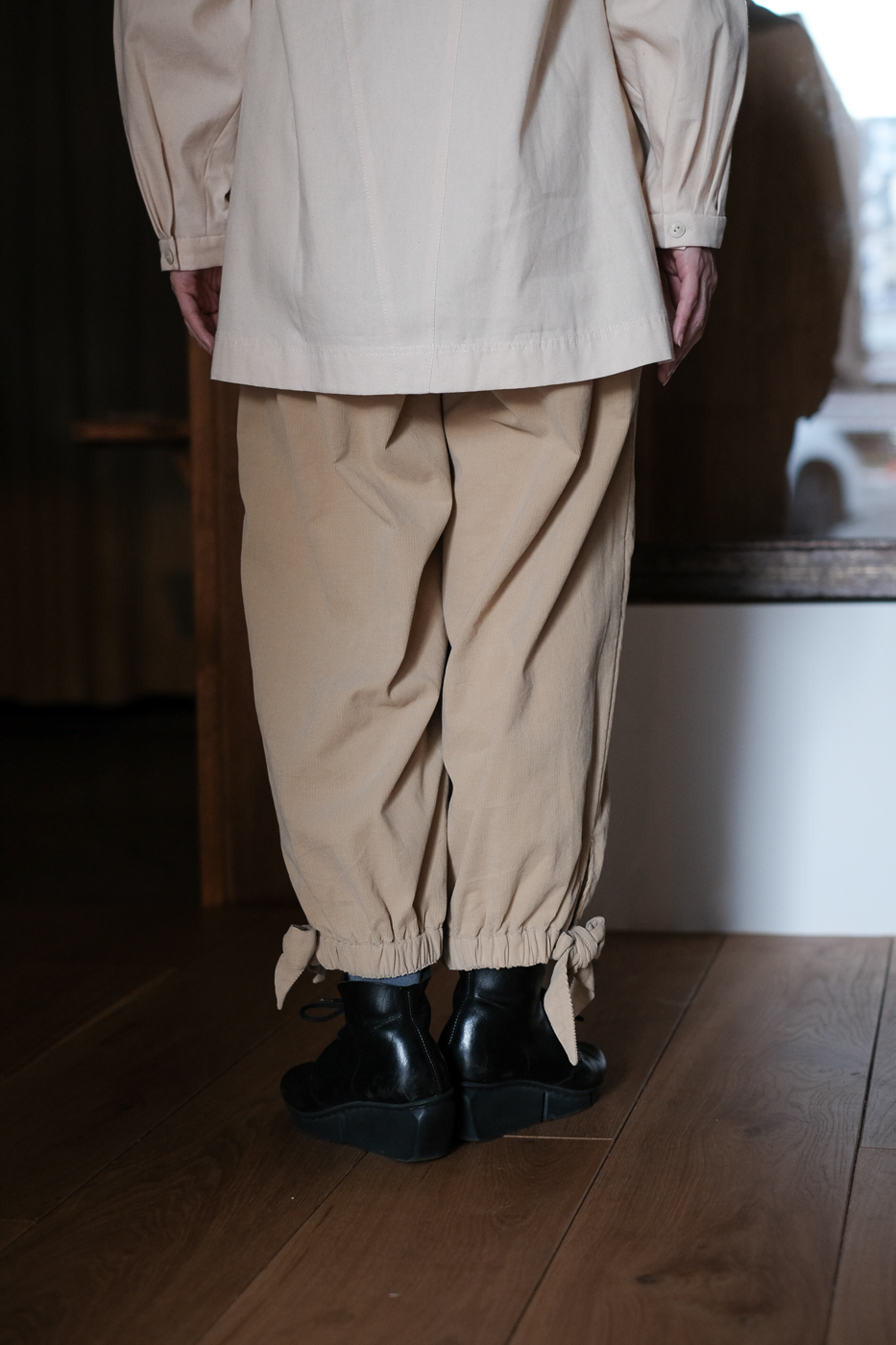 ウエストにタックが施され、裾はゴムに、