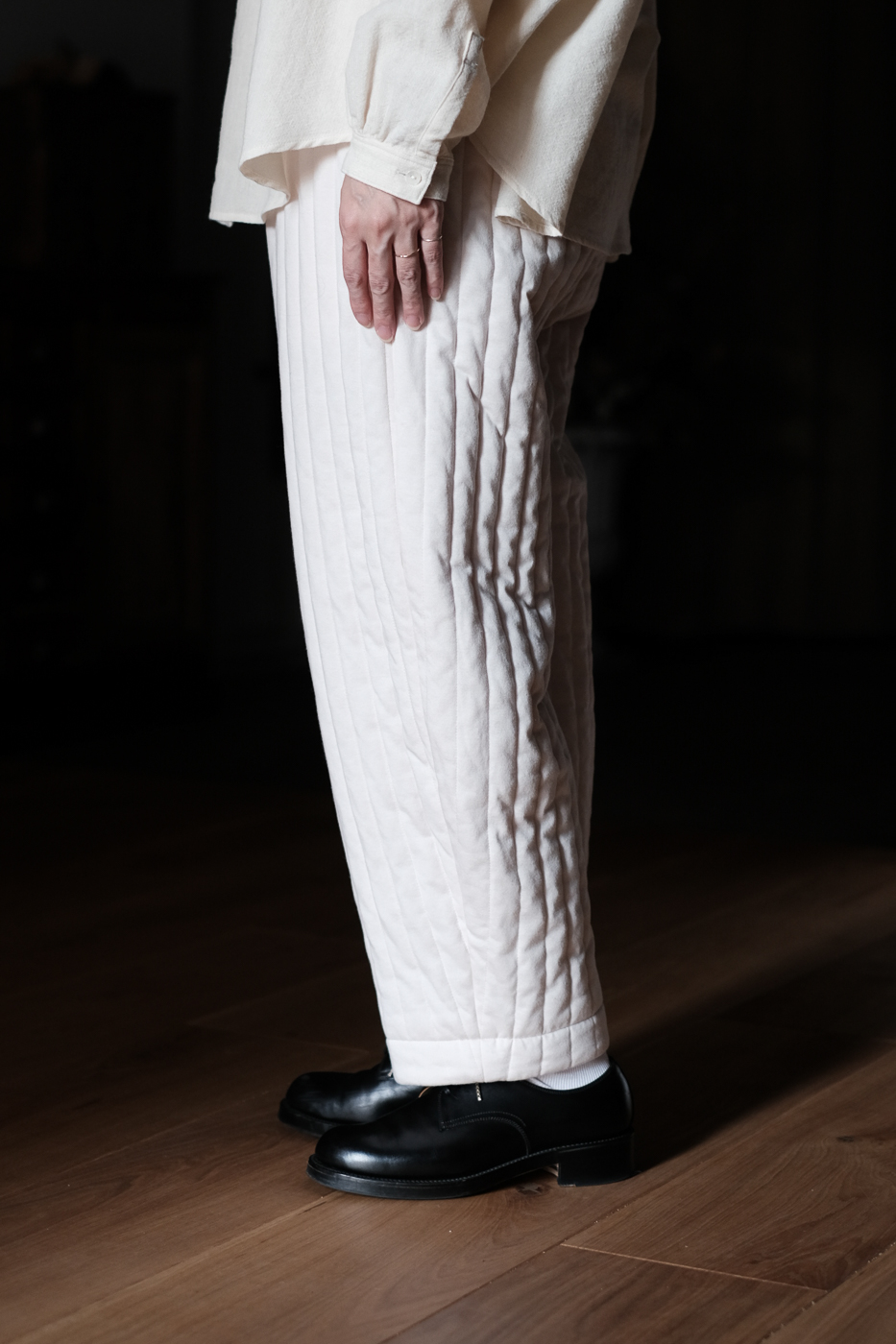 中綿入りのキルティングパンツ。