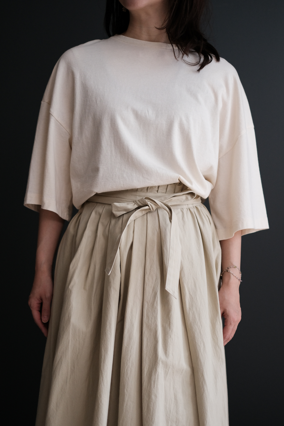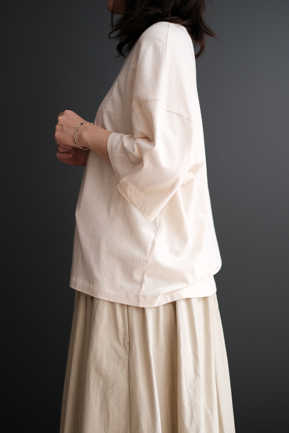少し袖口を広くとり、素材のドレープが美しく見える