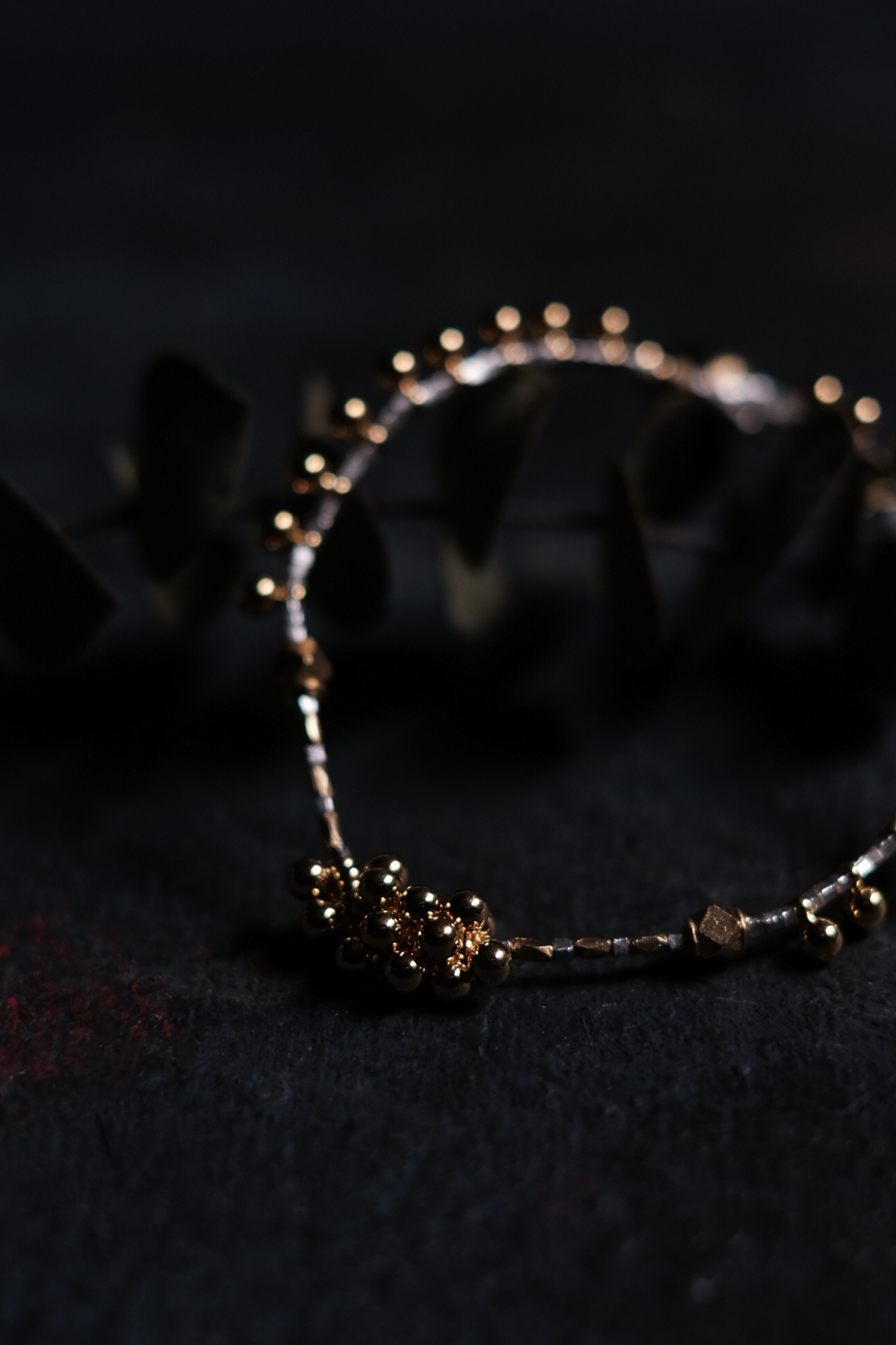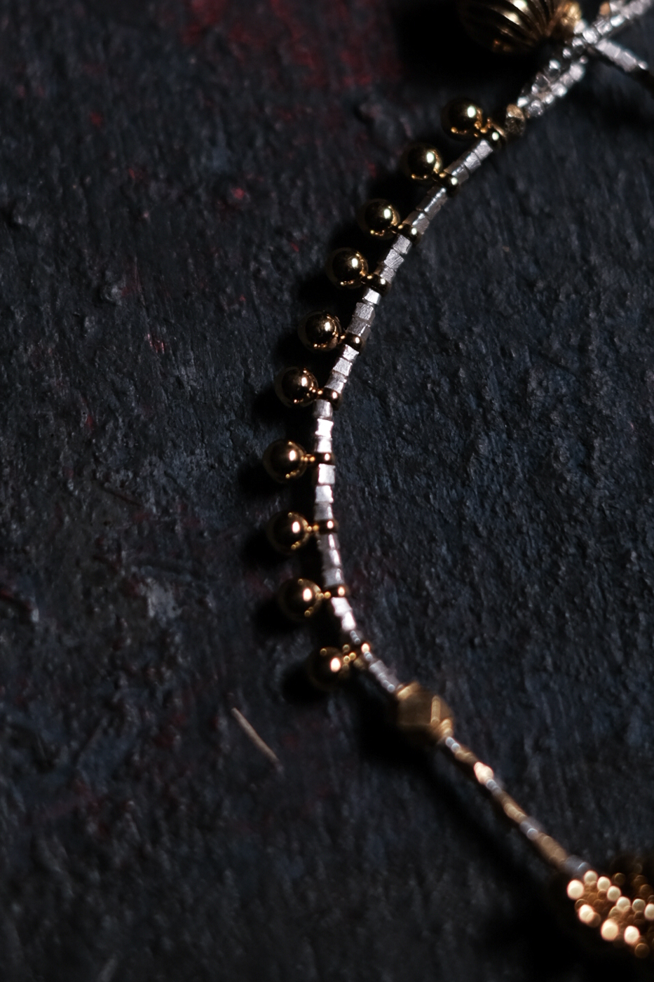 粒々の金鍍金加工を施した真鍮ビーズが散らばっている。