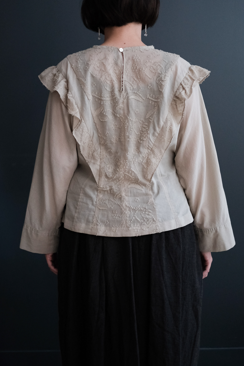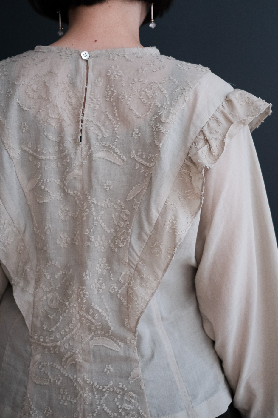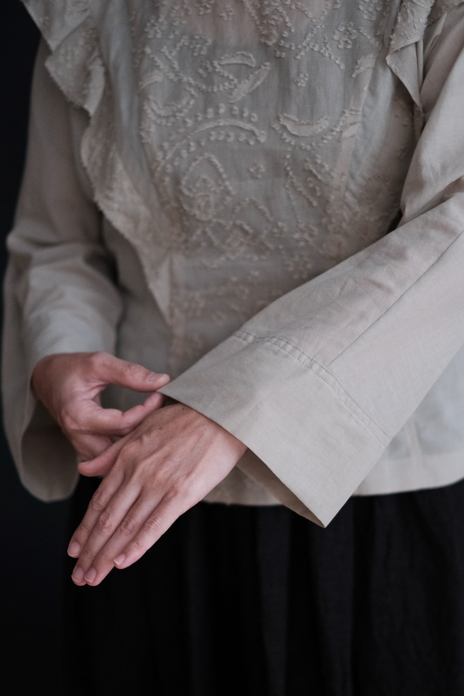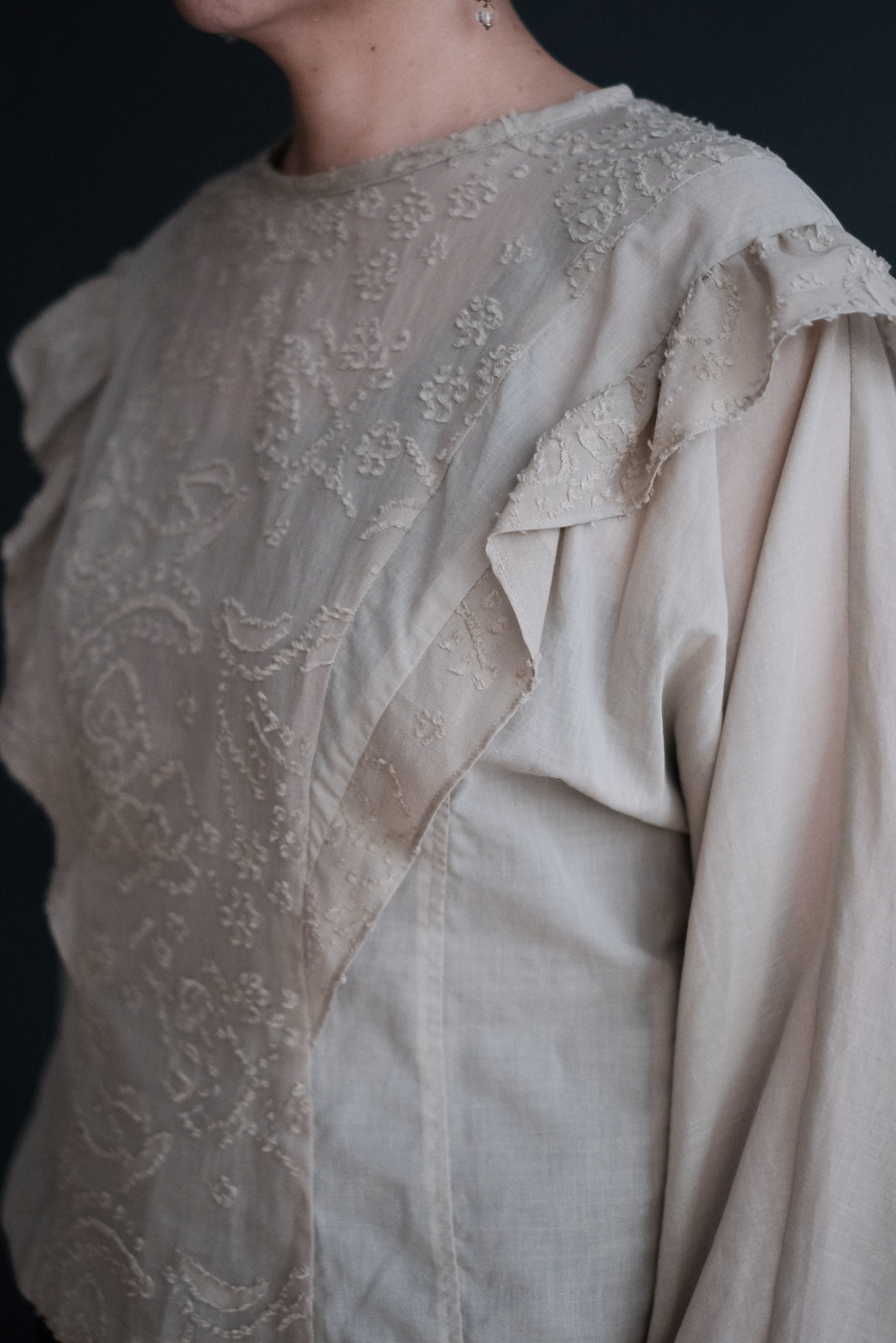 花びらの模様が繊細に優雅に浮かび上がる美しいブラウス。