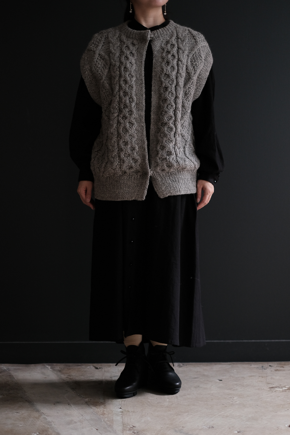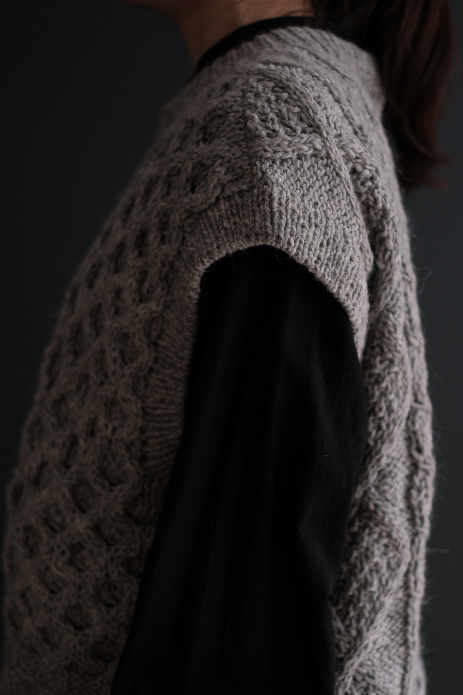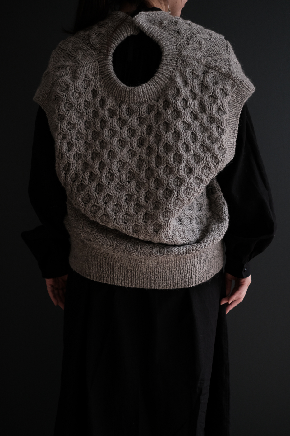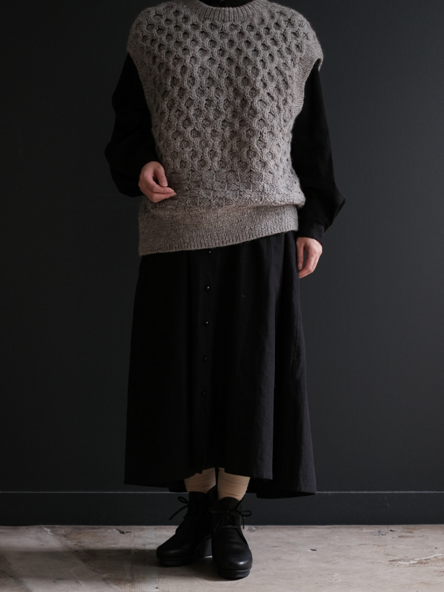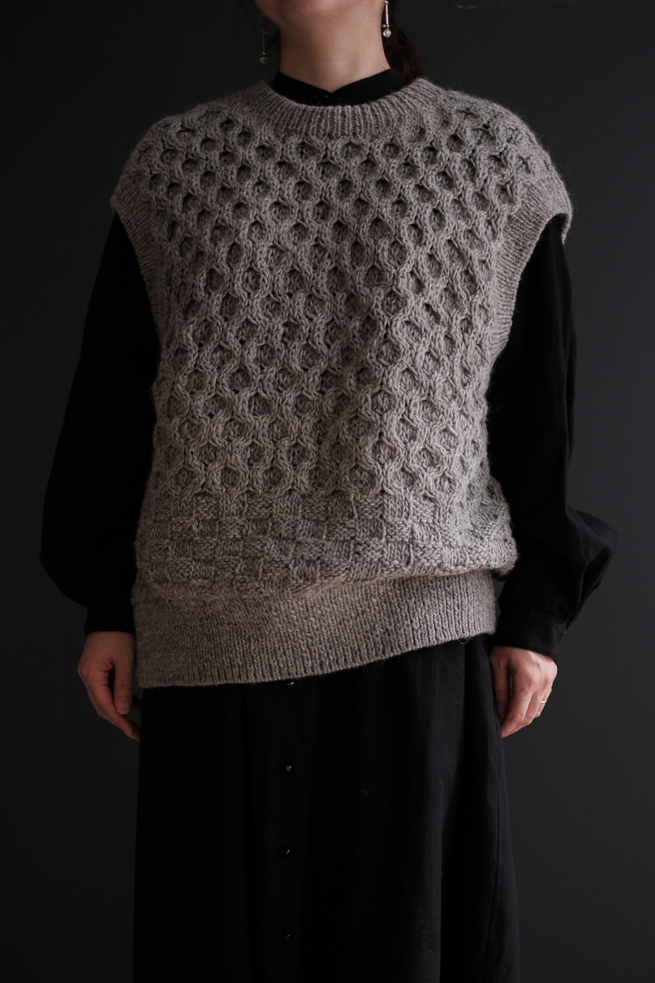 棒針で編まれたハンドアラン柄ベストです。