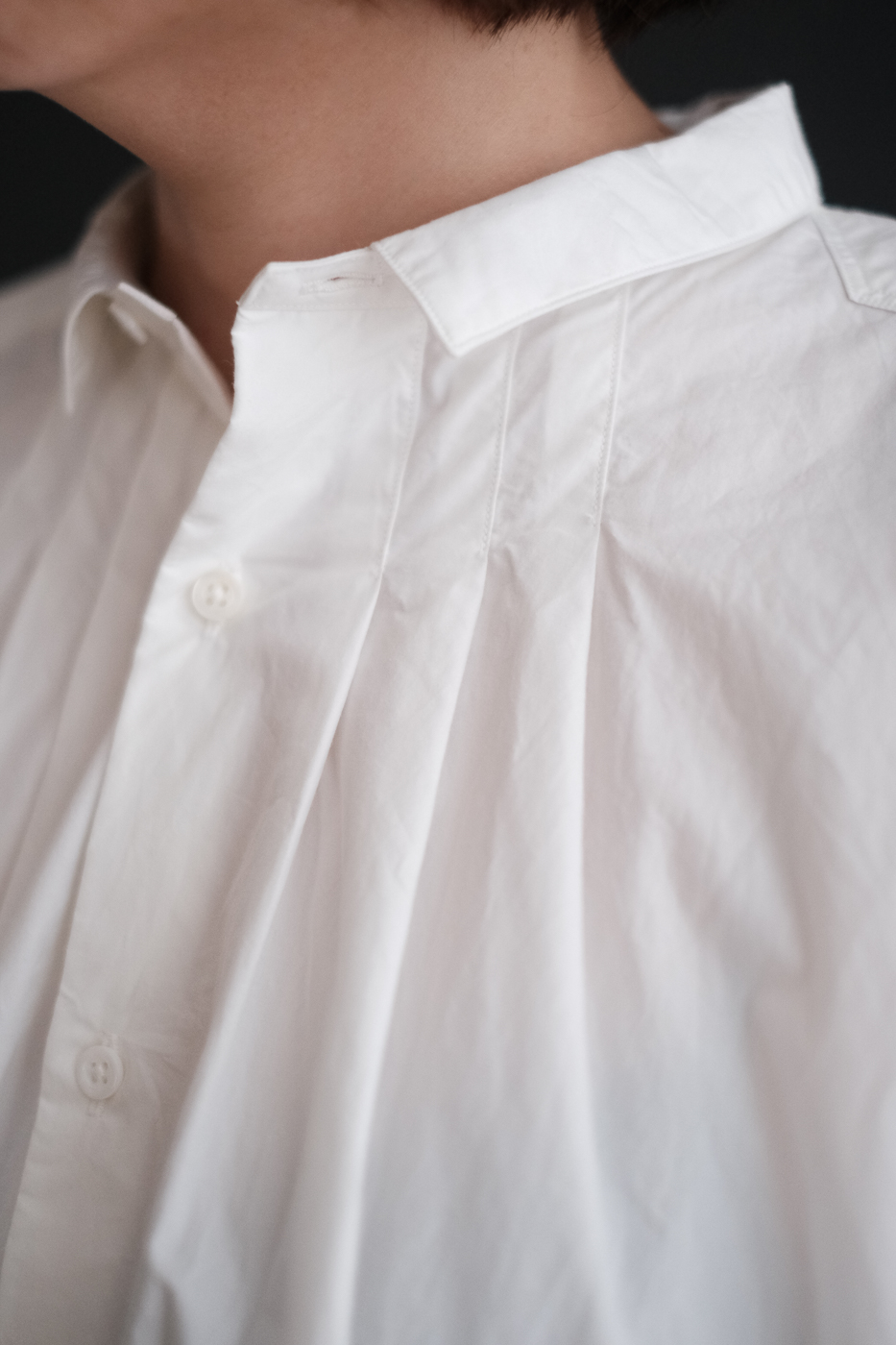 フロントの衿下に施されたタックと、肩のヨーク部分、