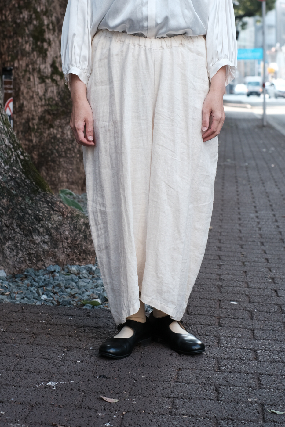 膝下から内側に向かう生地の流れが美しく、