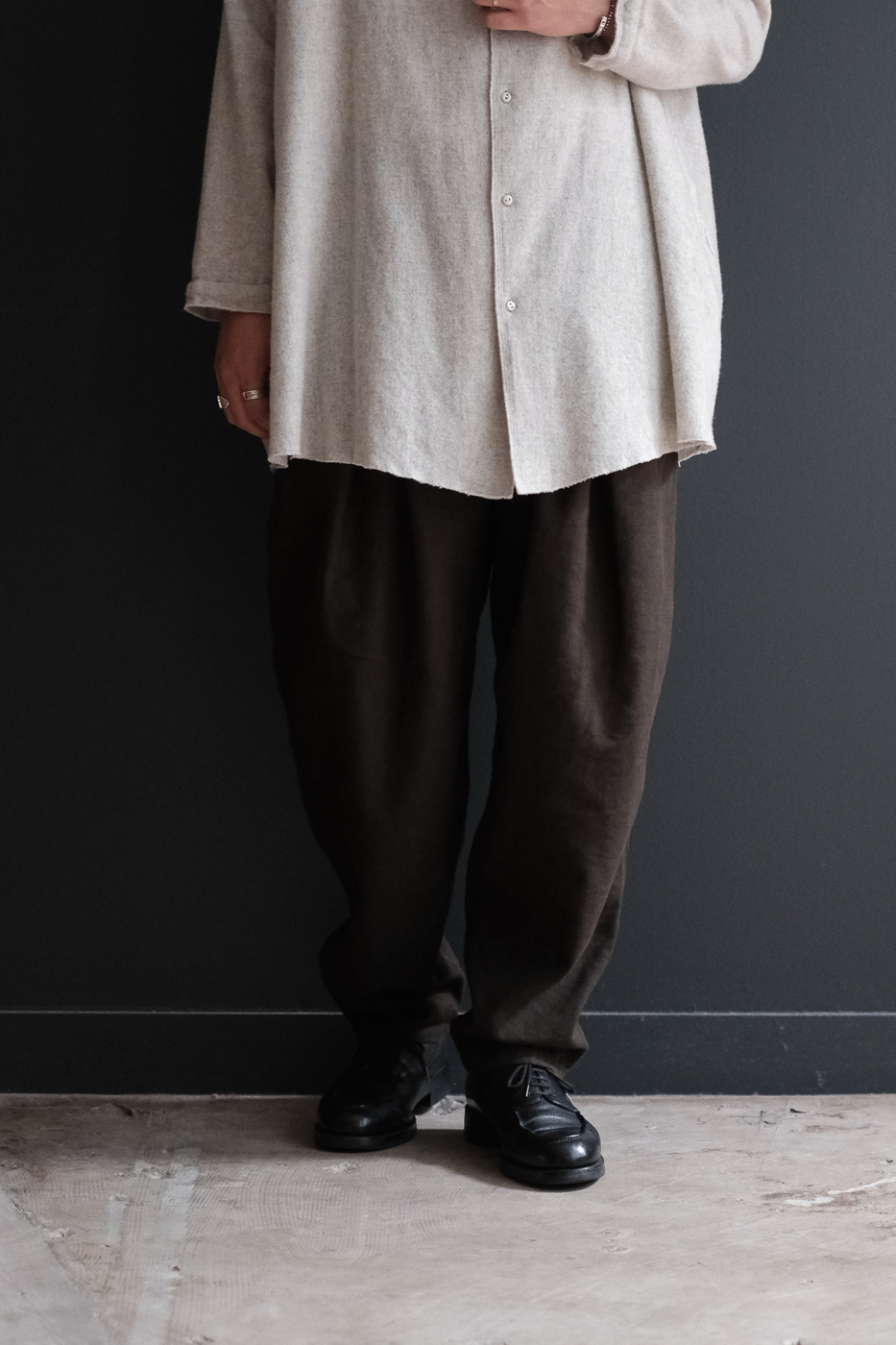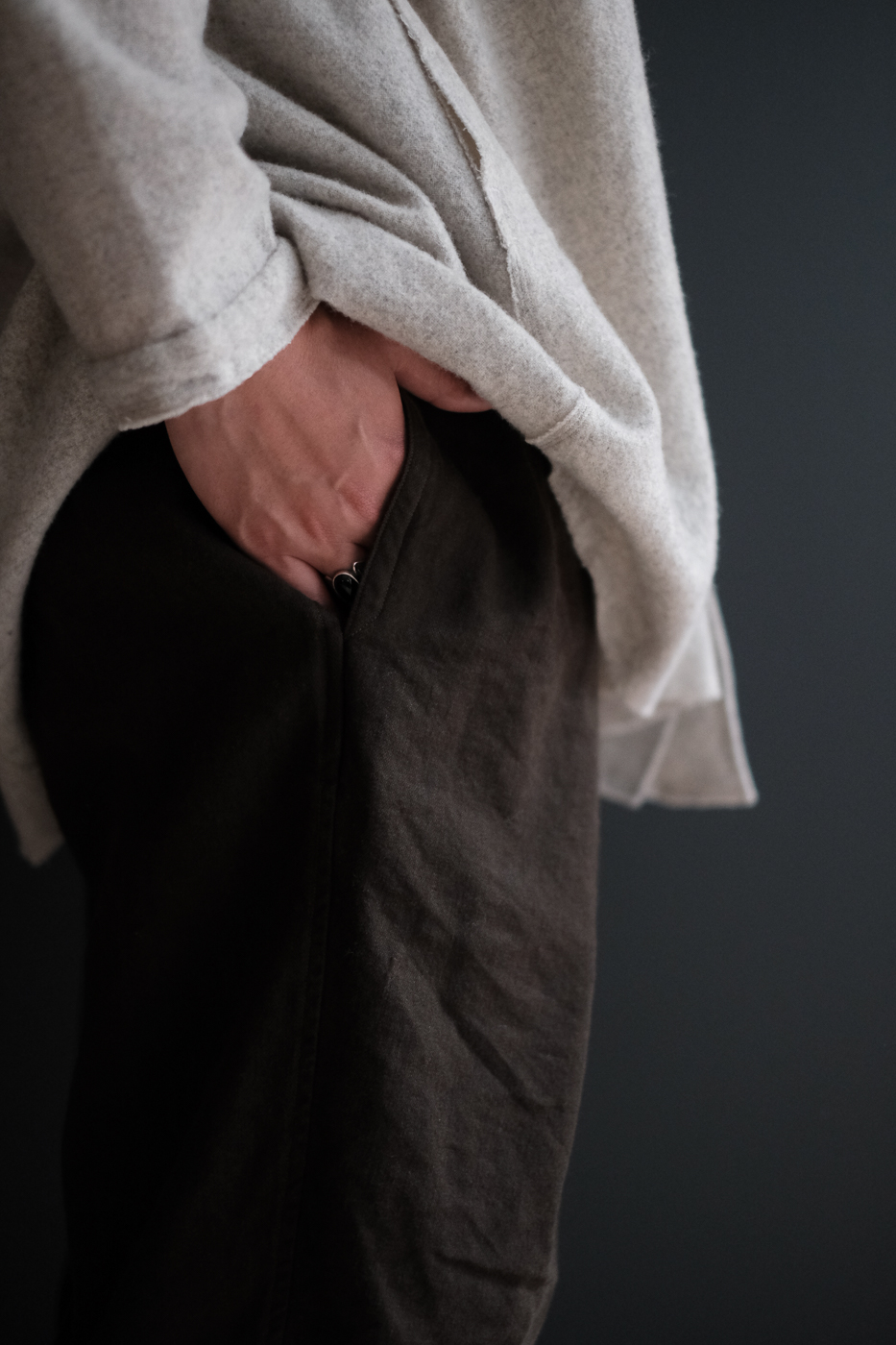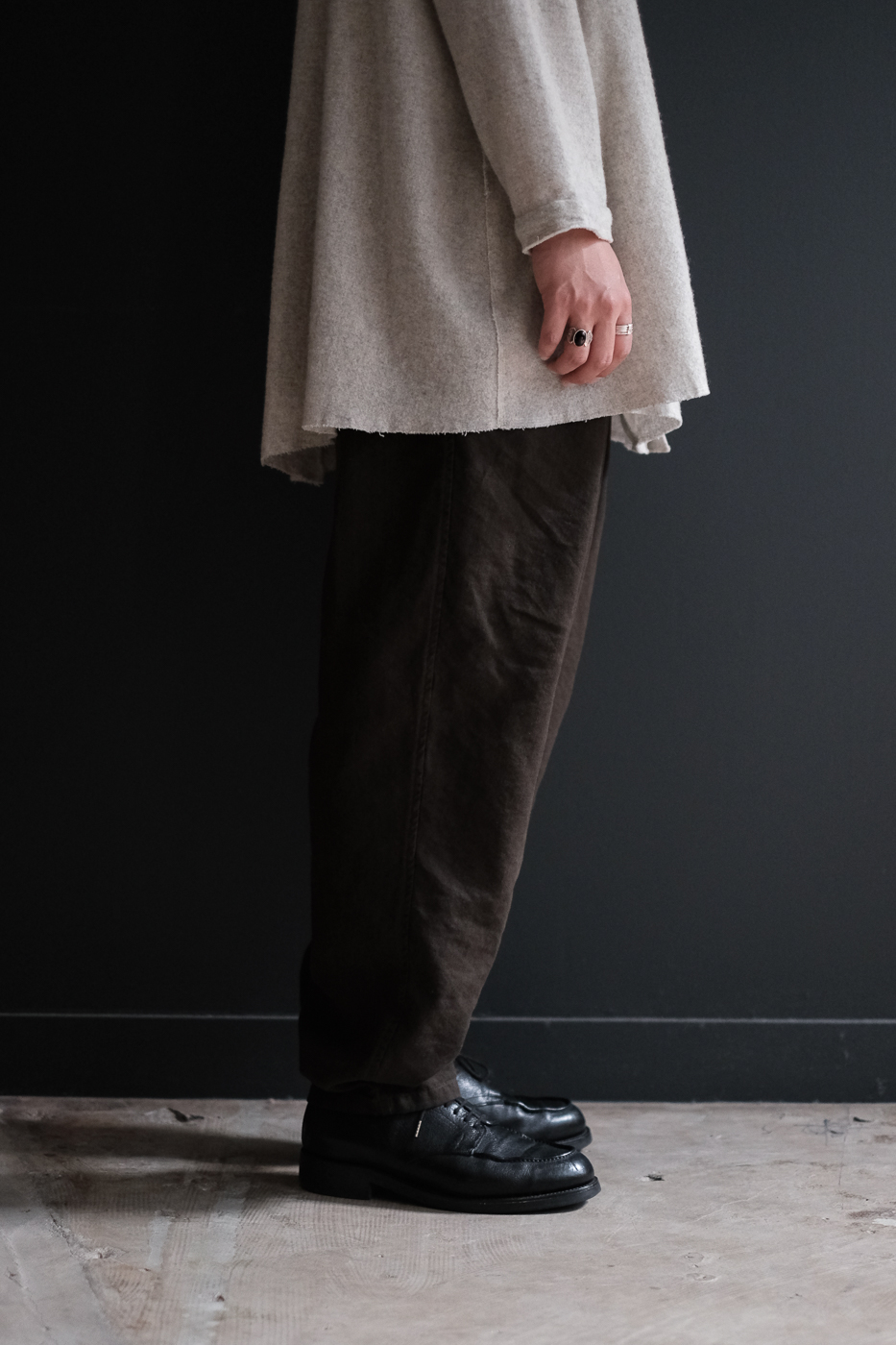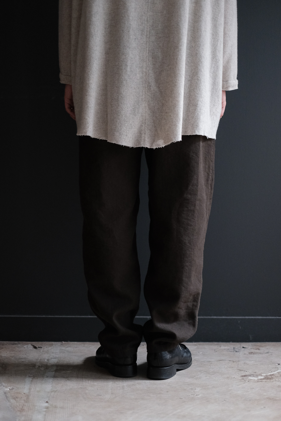 ひざ下から裾にかけて細くなるテーパードパンツ。