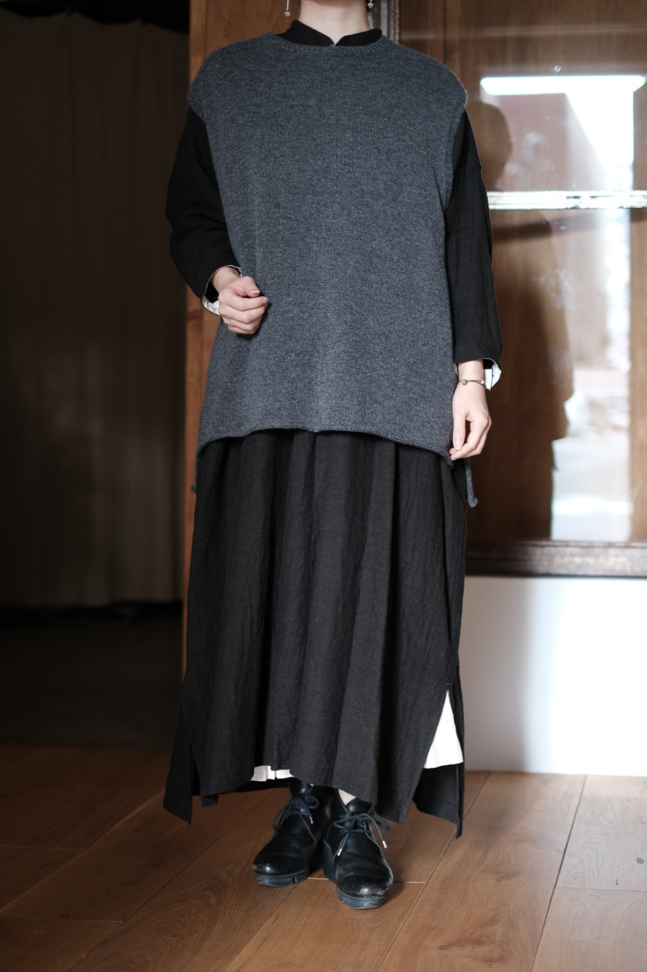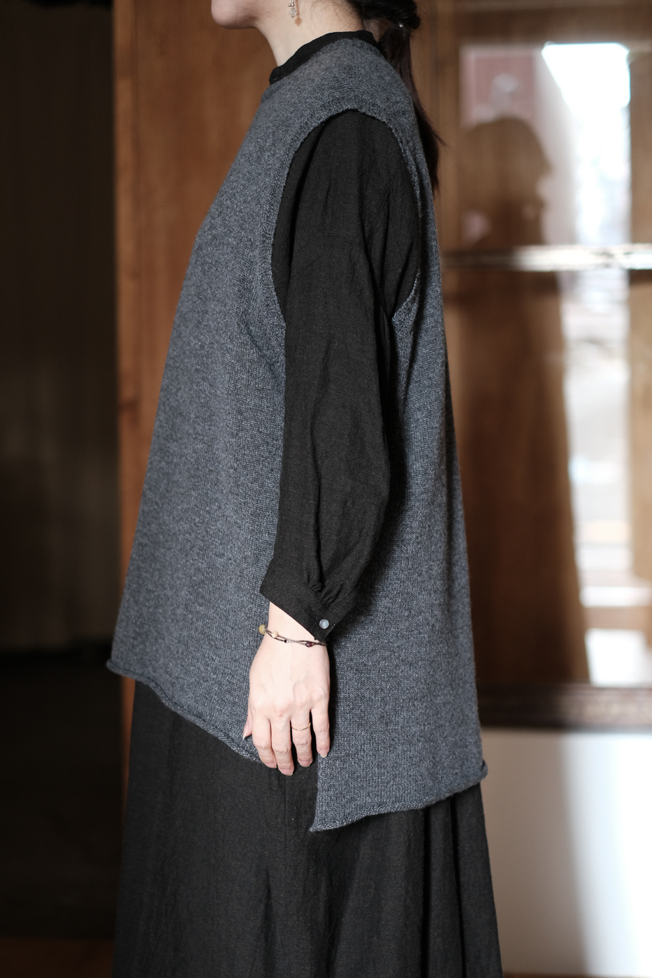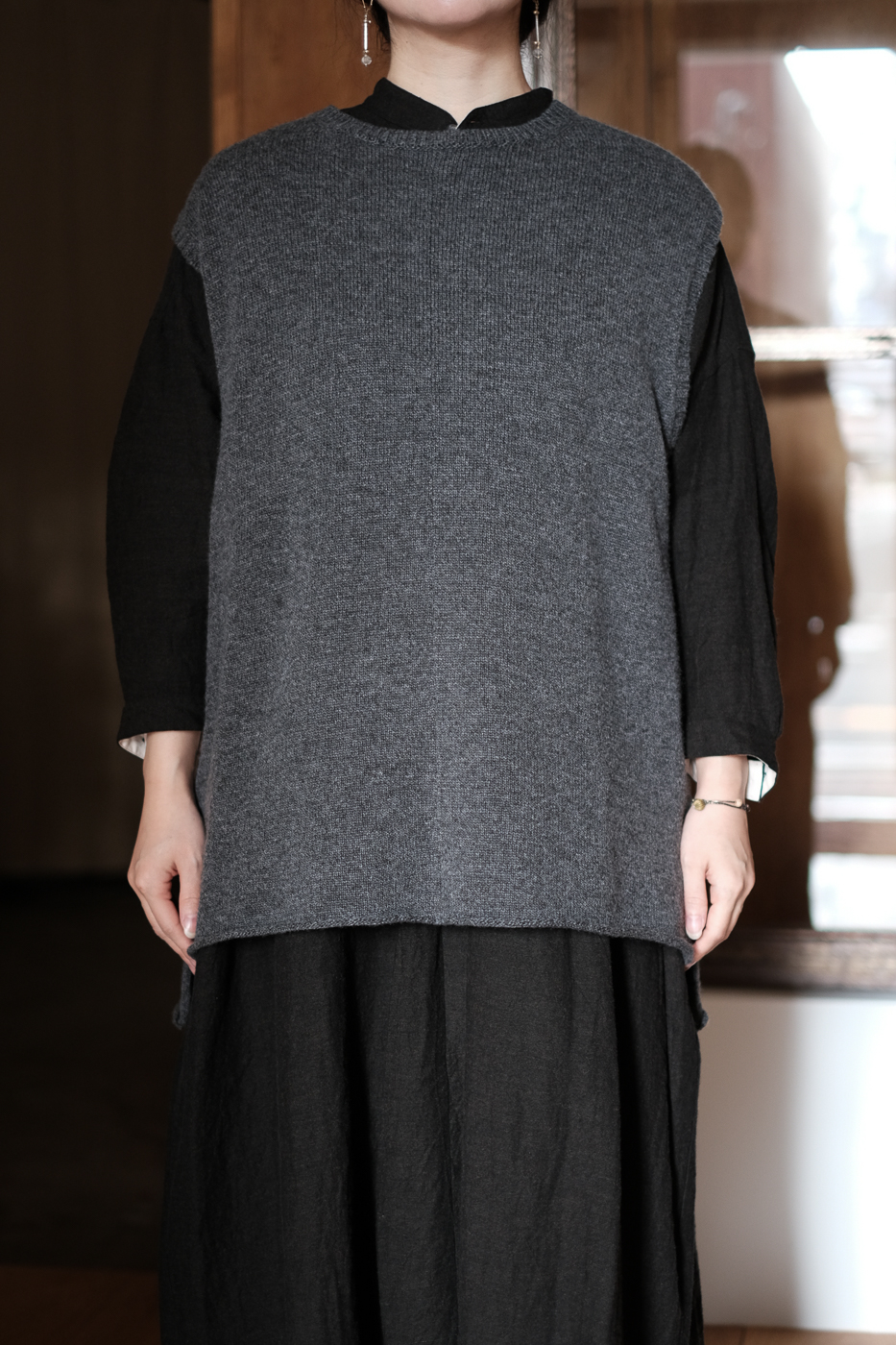 柔らかな印象の身幅をもたせたニットベストになります。