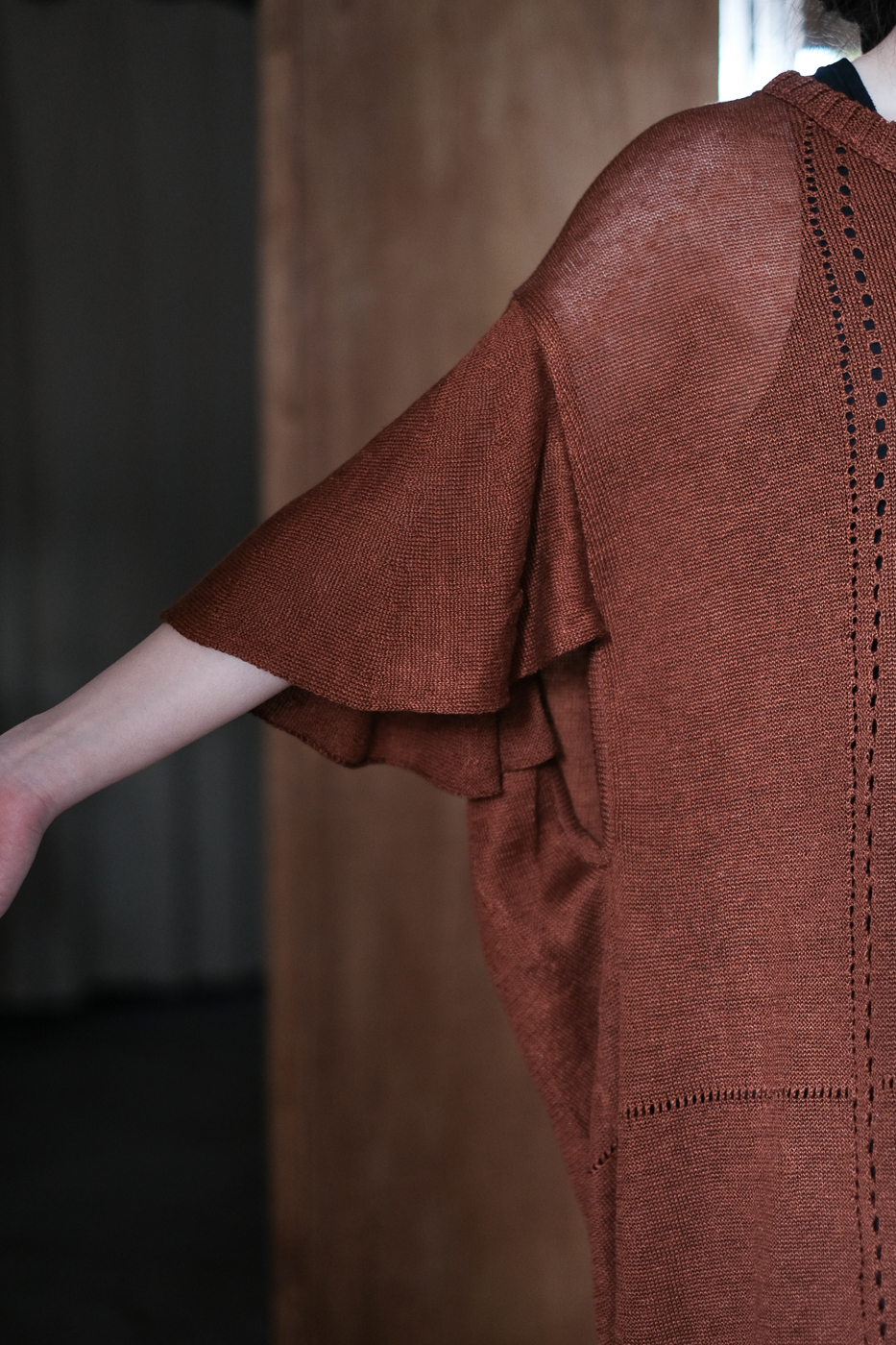 肩から落ちるフレアースリーブが
