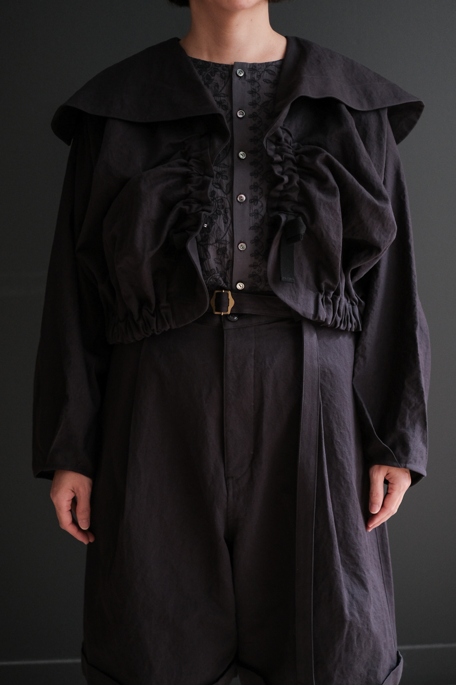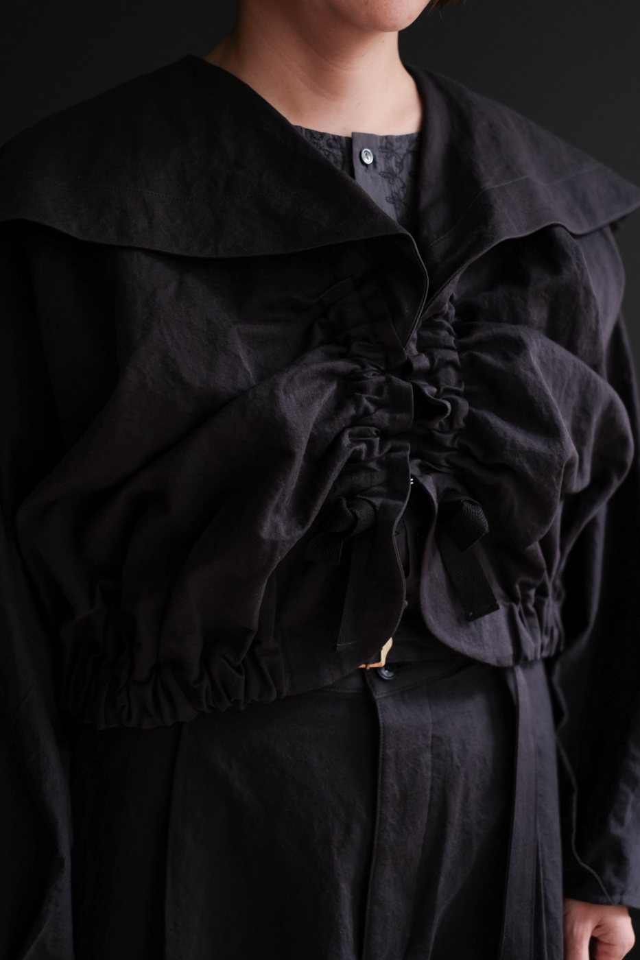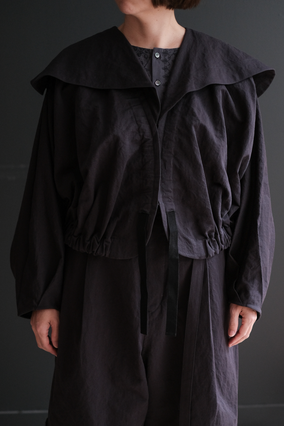 大きな襟のデザイン、そして紐を伸ばしたり