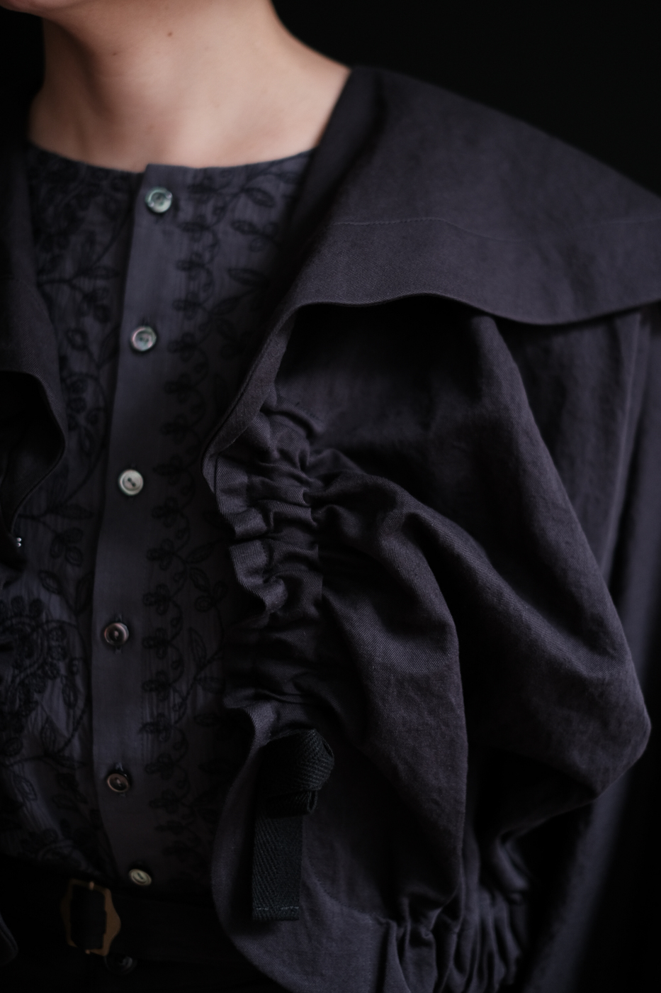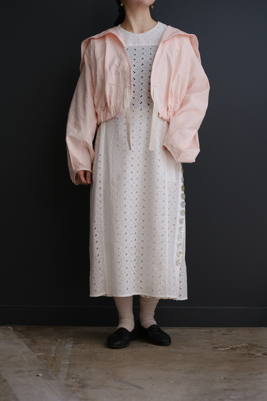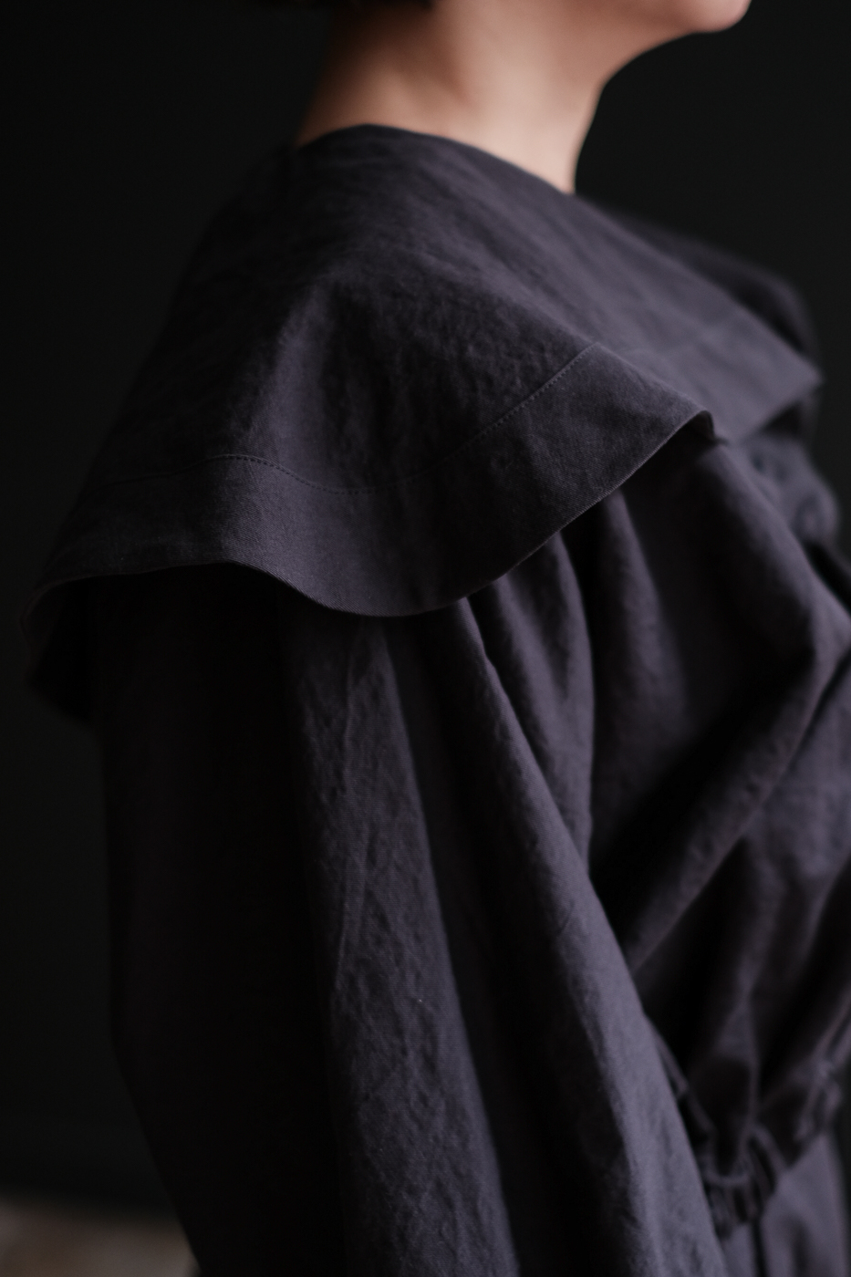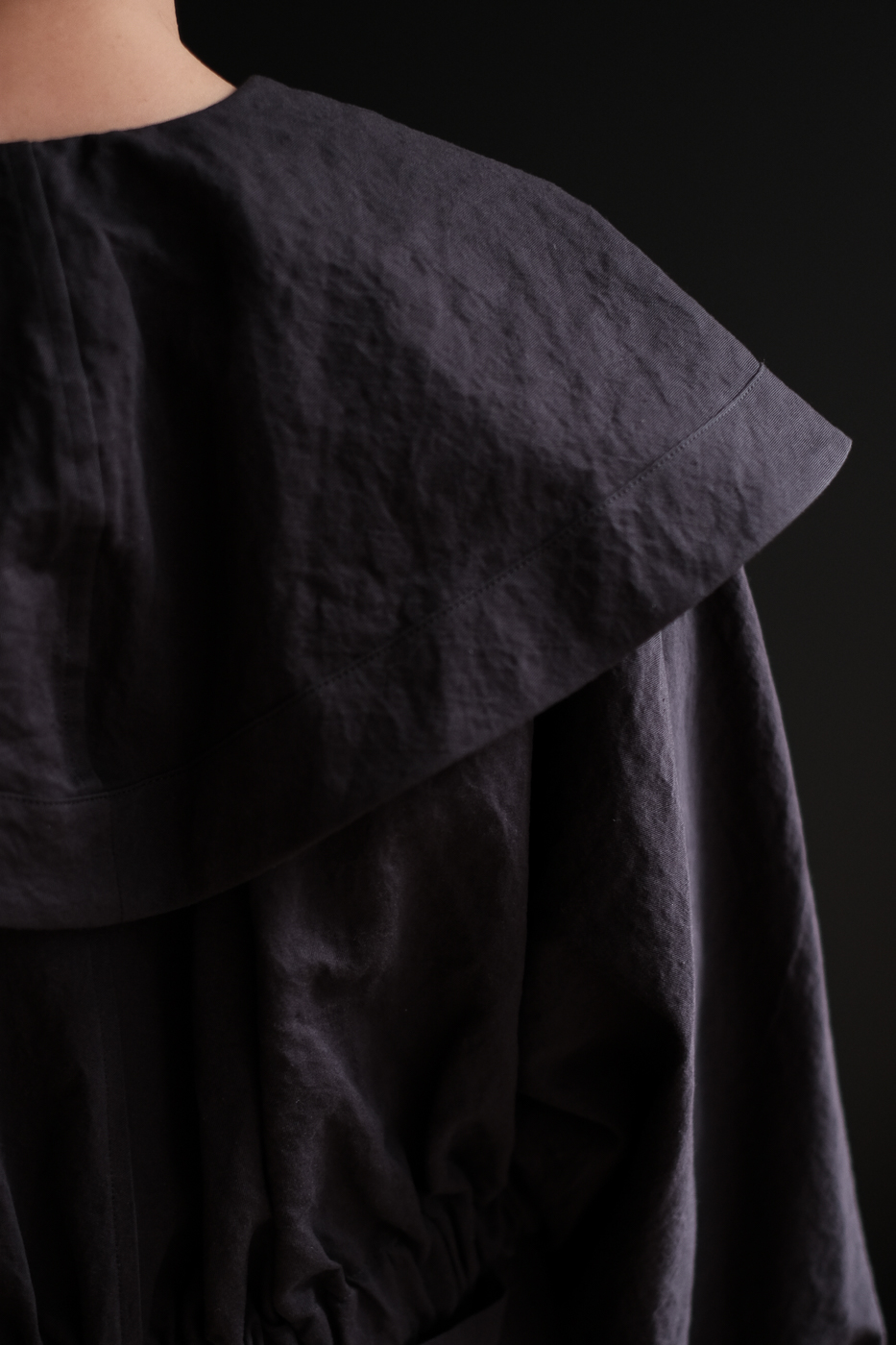 大きな襟のデザイン、そして紐を伸ばしたり