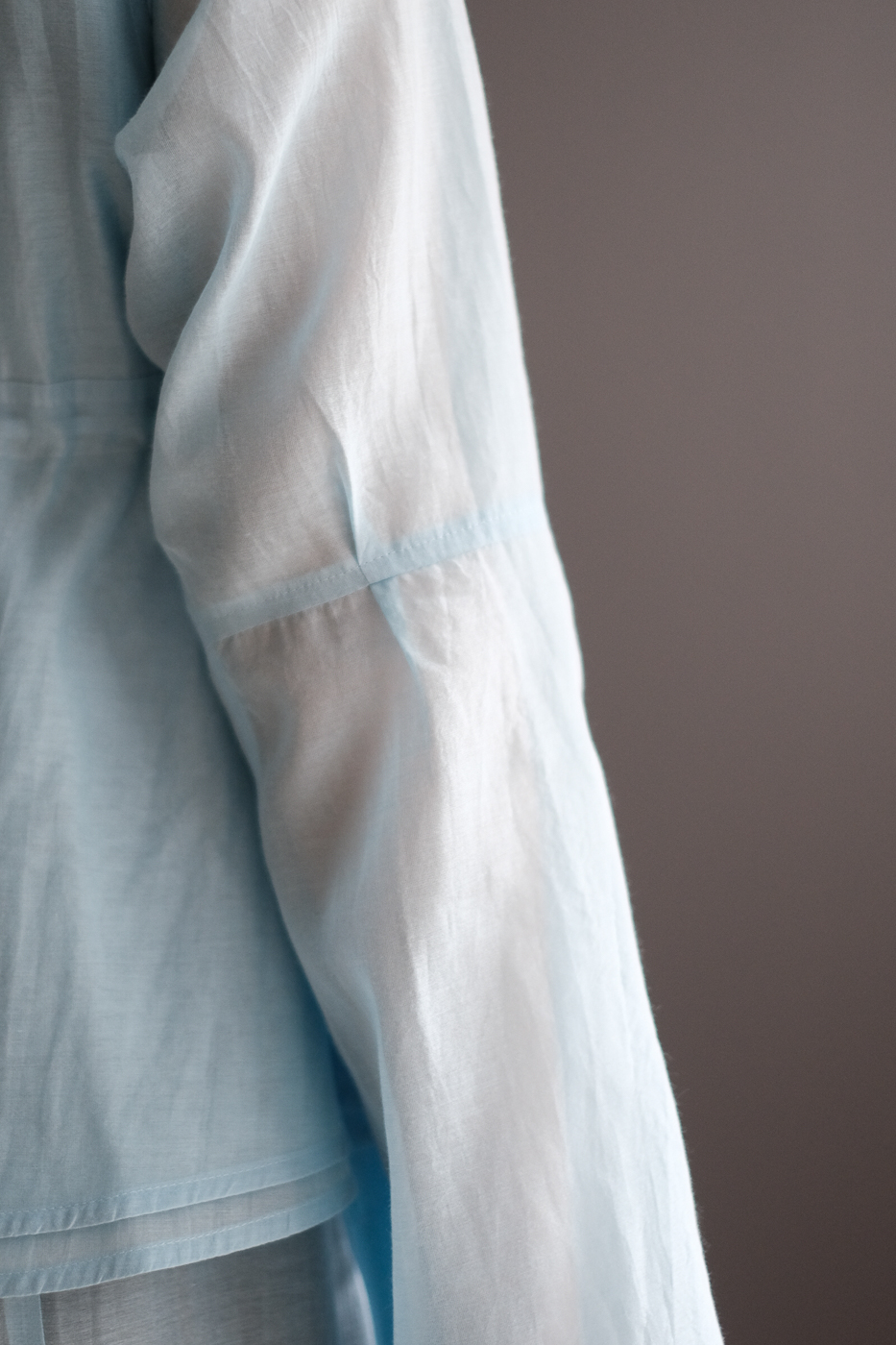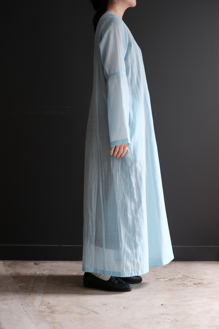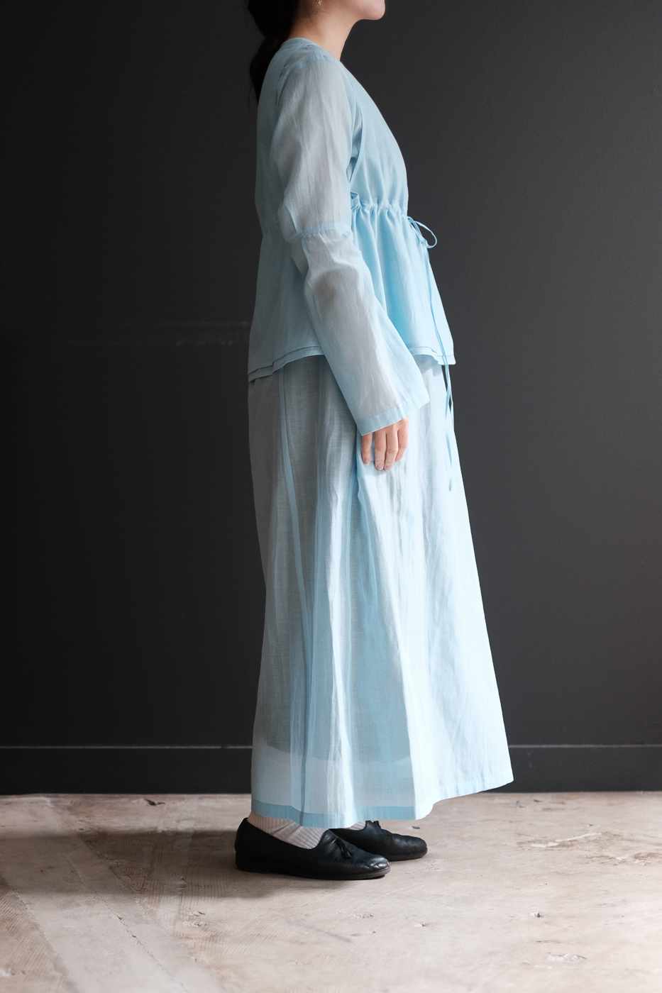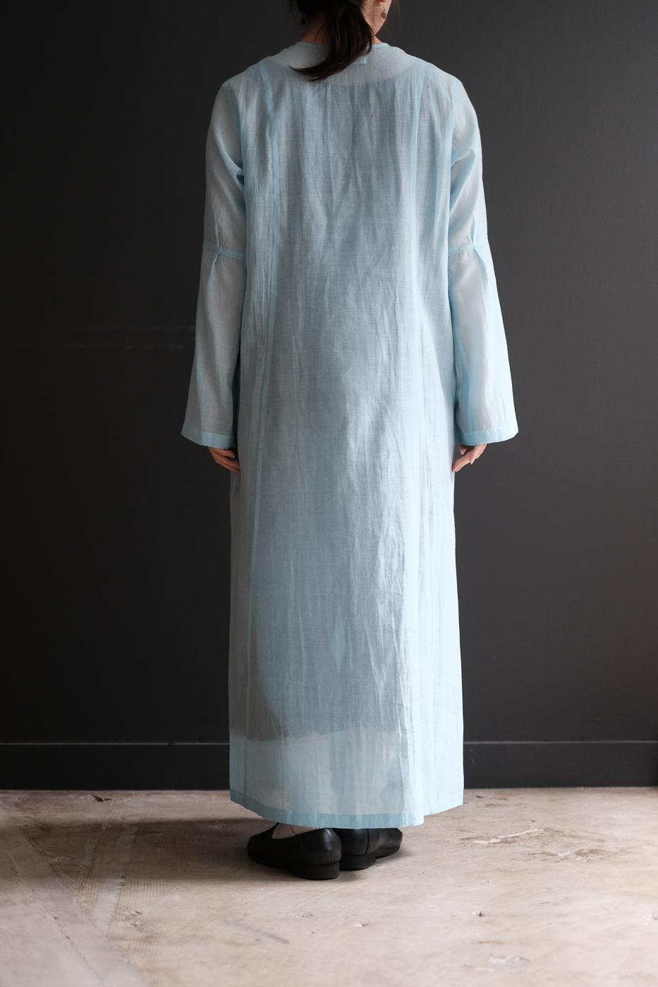 直線的に広がるドレスと、ブラウジングと生地の重なり合いで