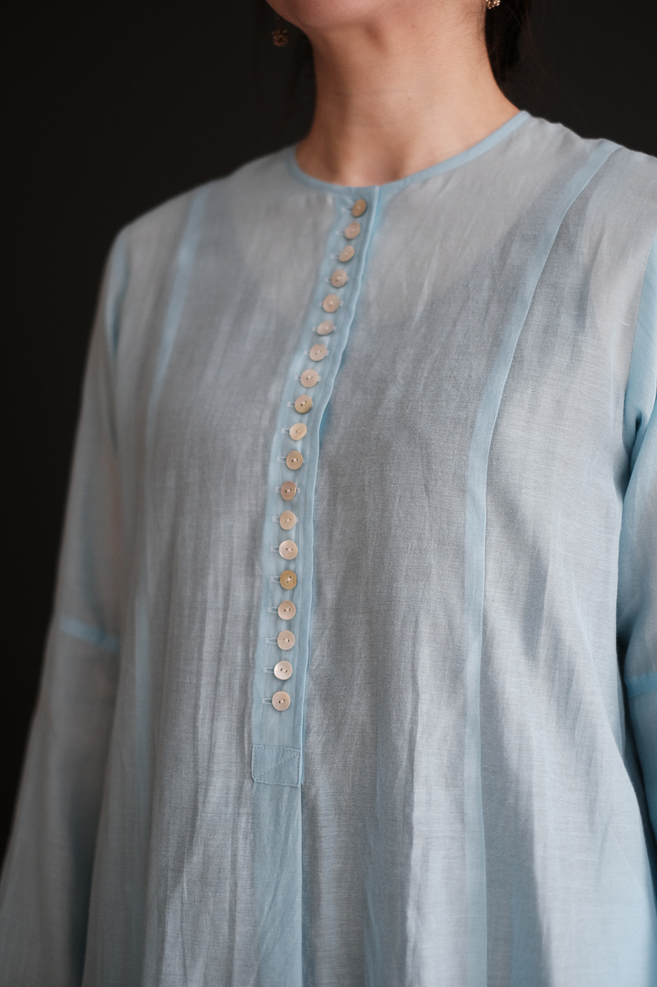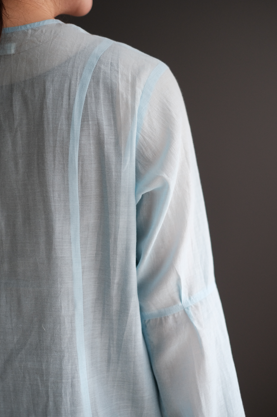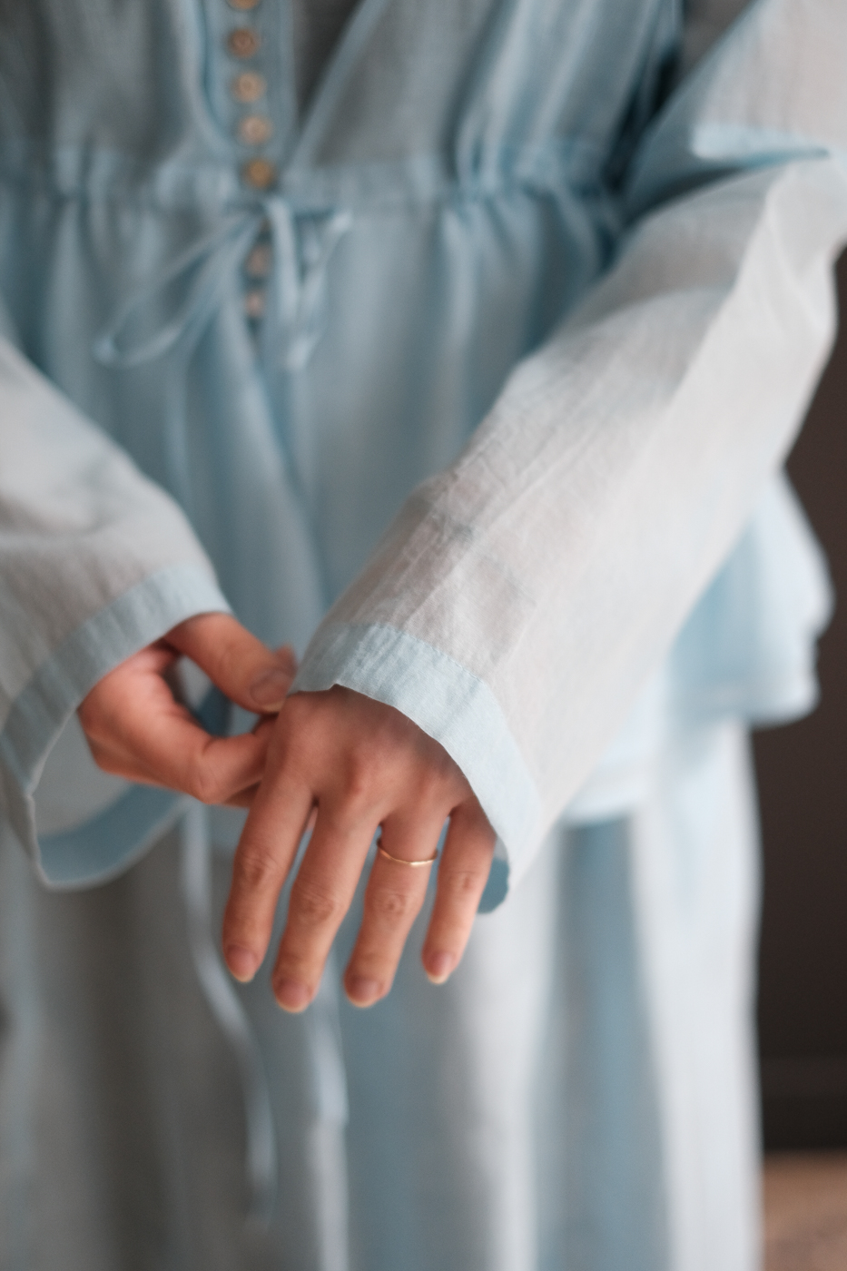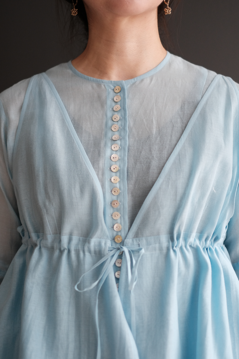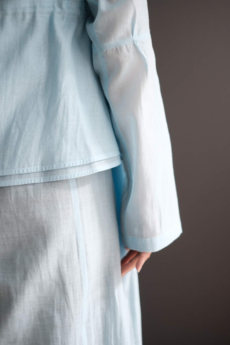 直線的に広がるドレスと、ブラウジングと生地の重なり合いで