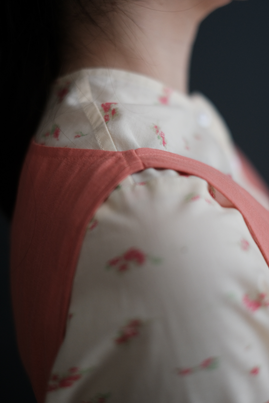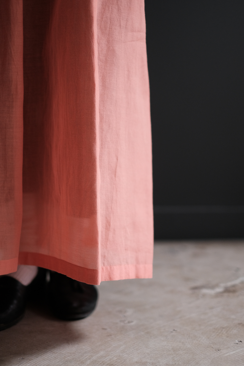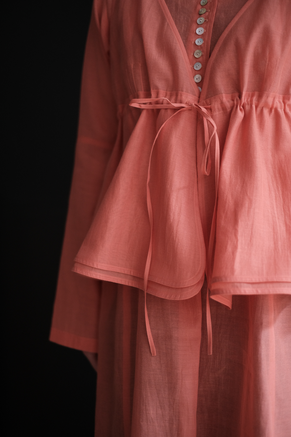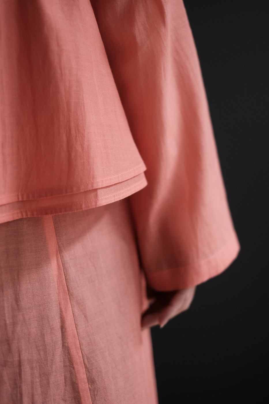 直線的に広がるドレスと、ブラウジングと生地の重なり合いで