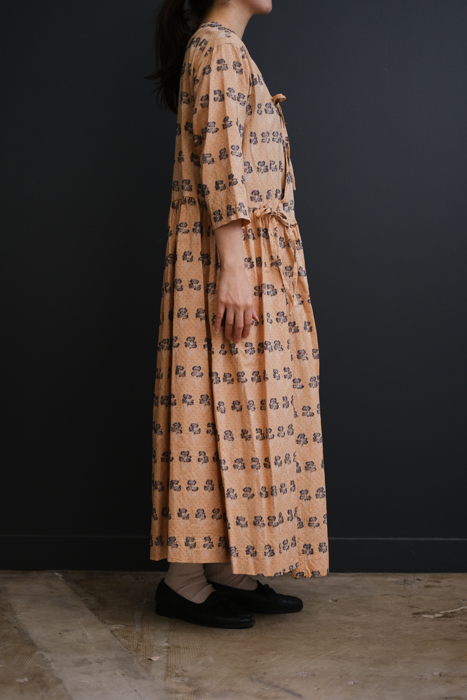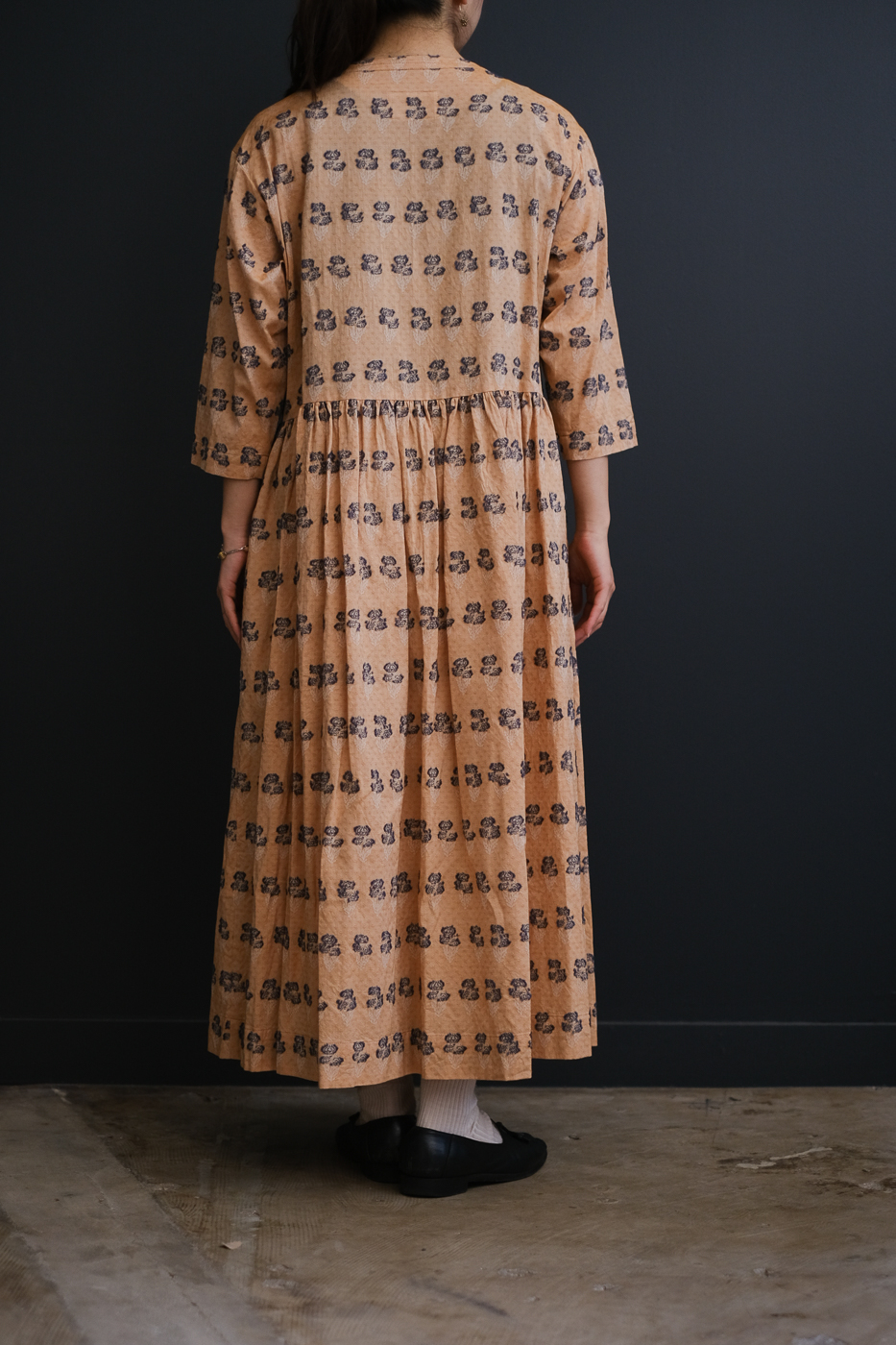 総柄と長めの着丈で華やかさを演出しています。