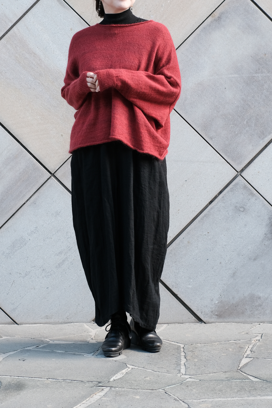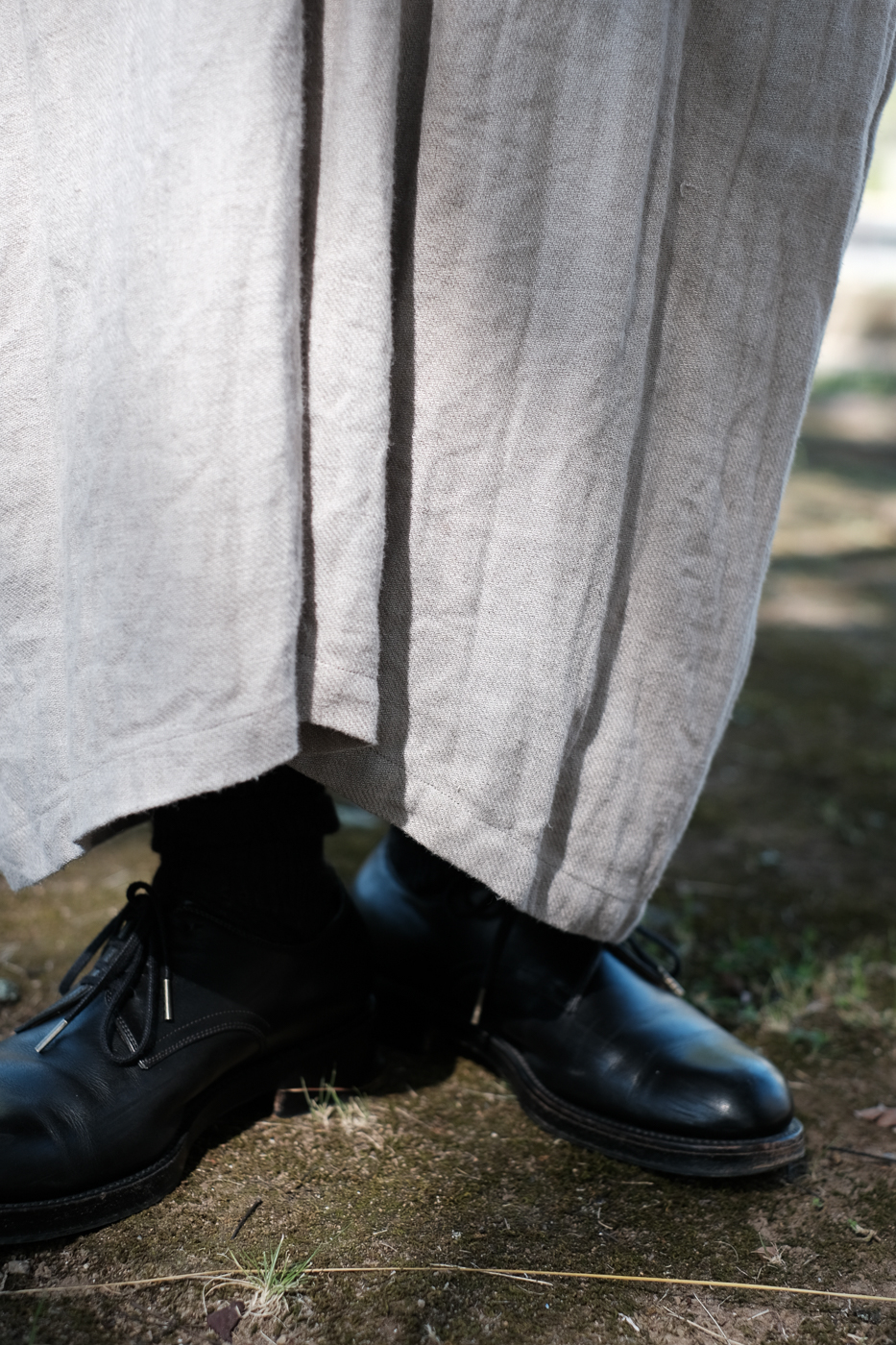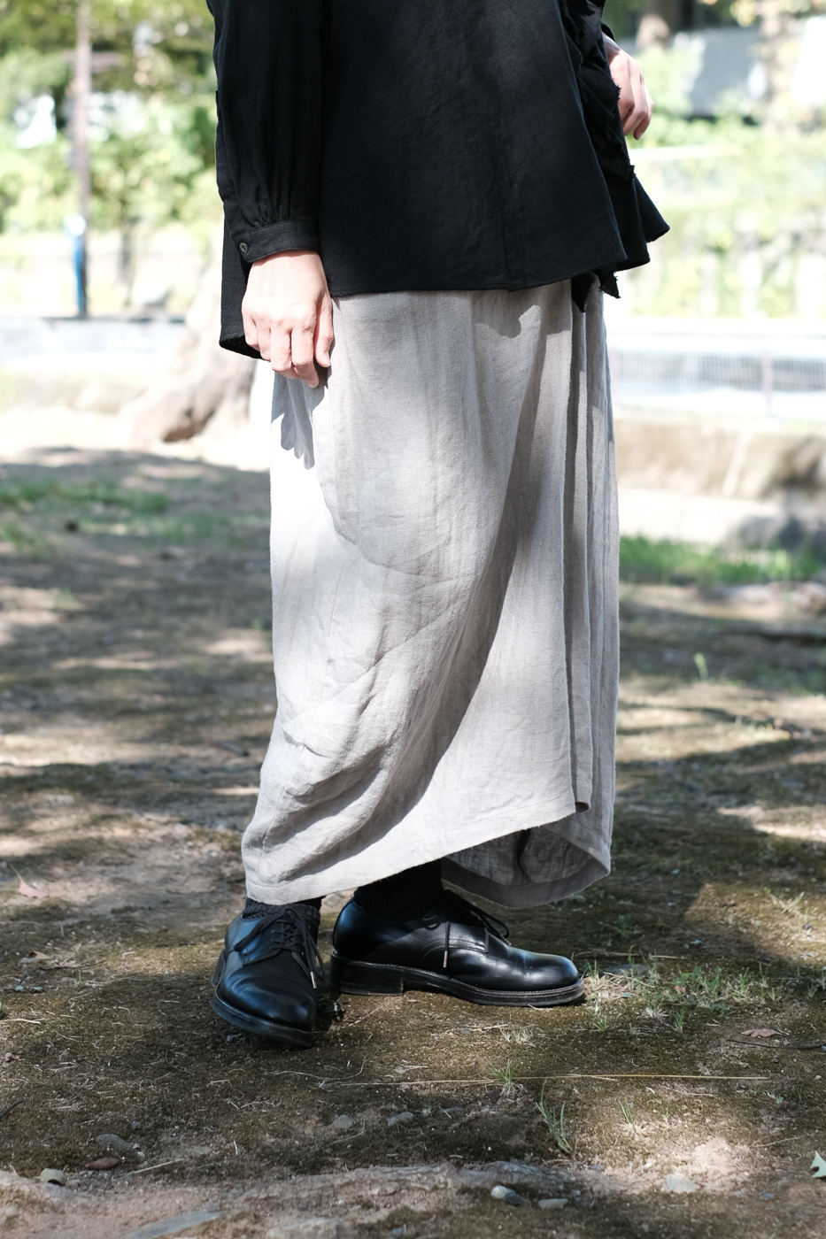 膝下から内側に向かう生地の流れが美しく、