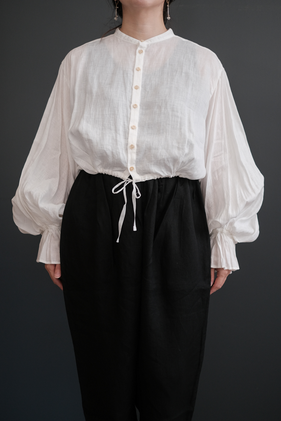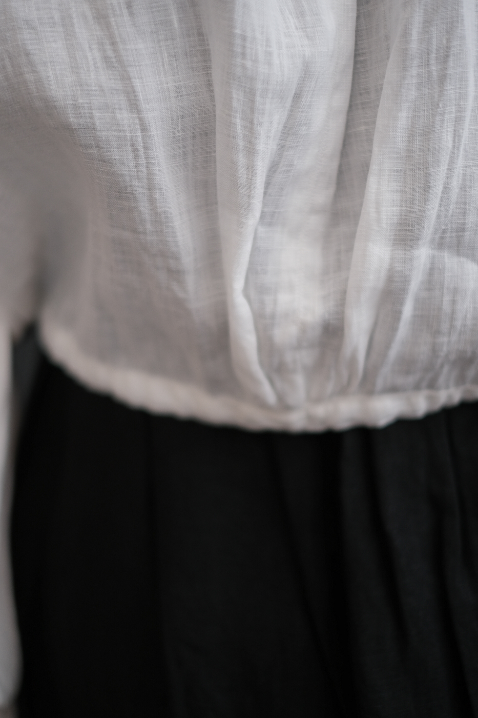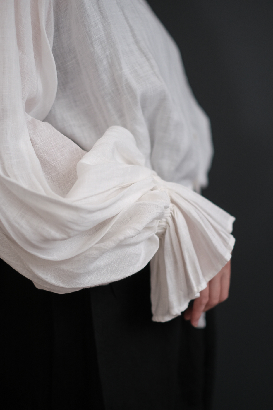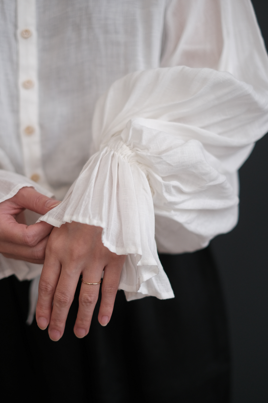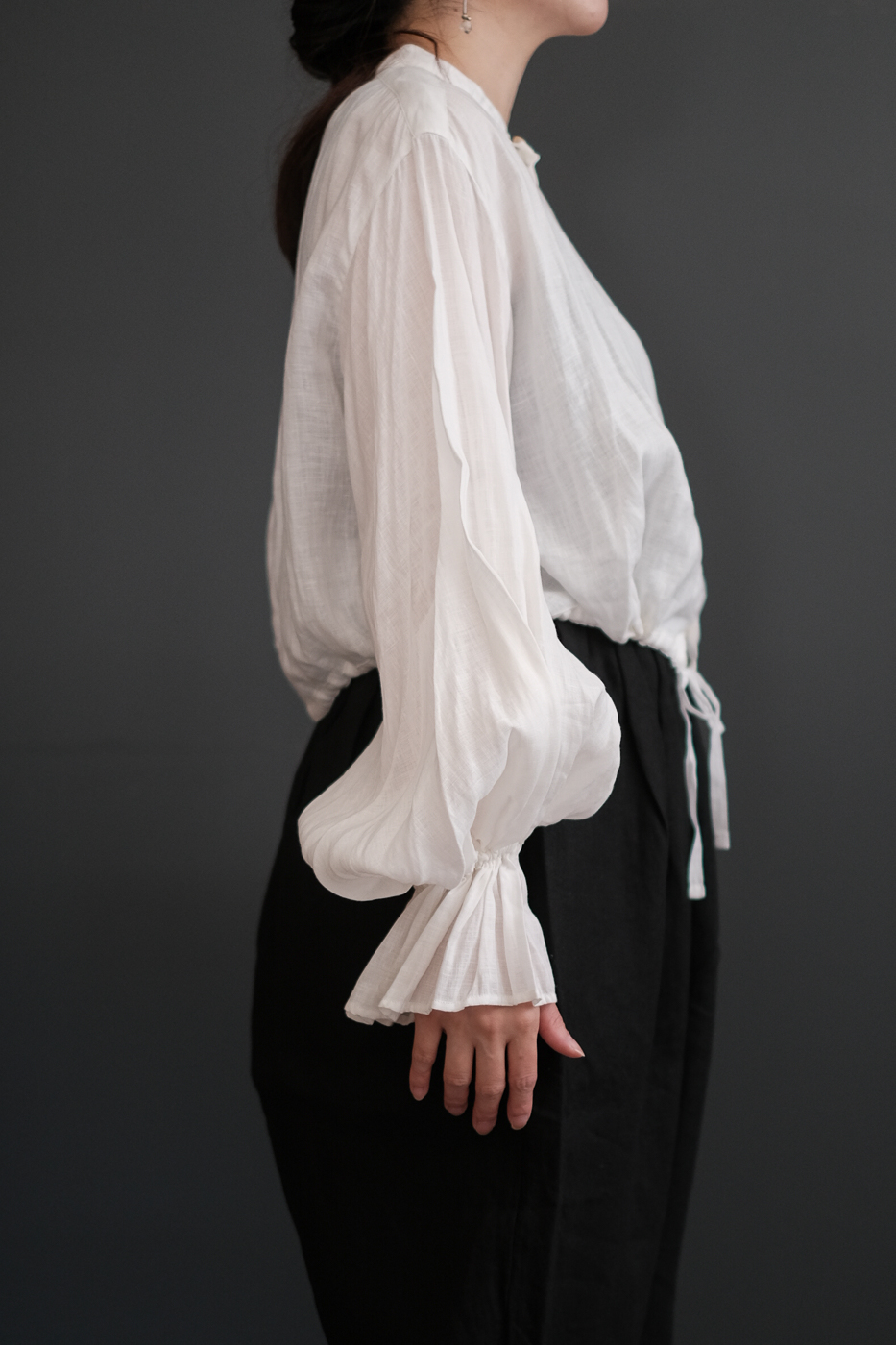 肘まで上げて袖の膨らみを強めて