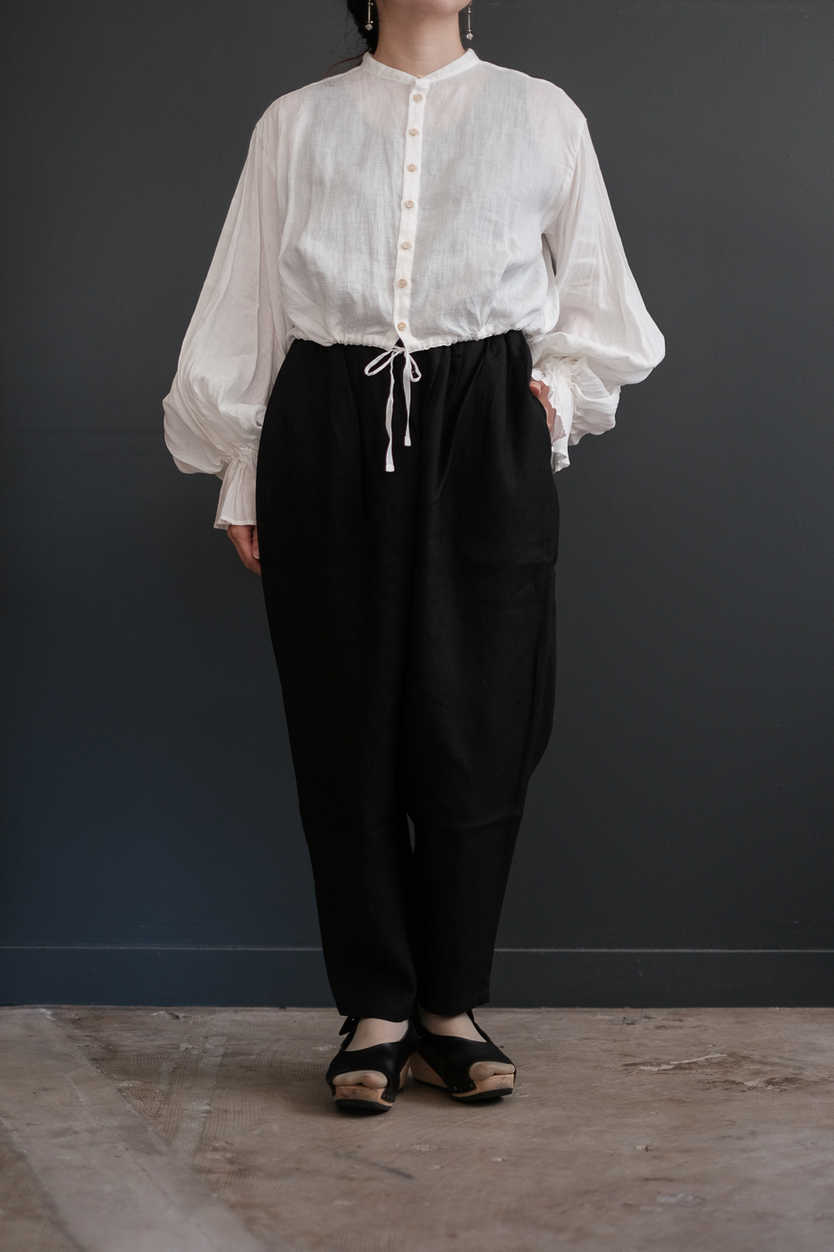 肘まで上げて袖の膨らみを強めて