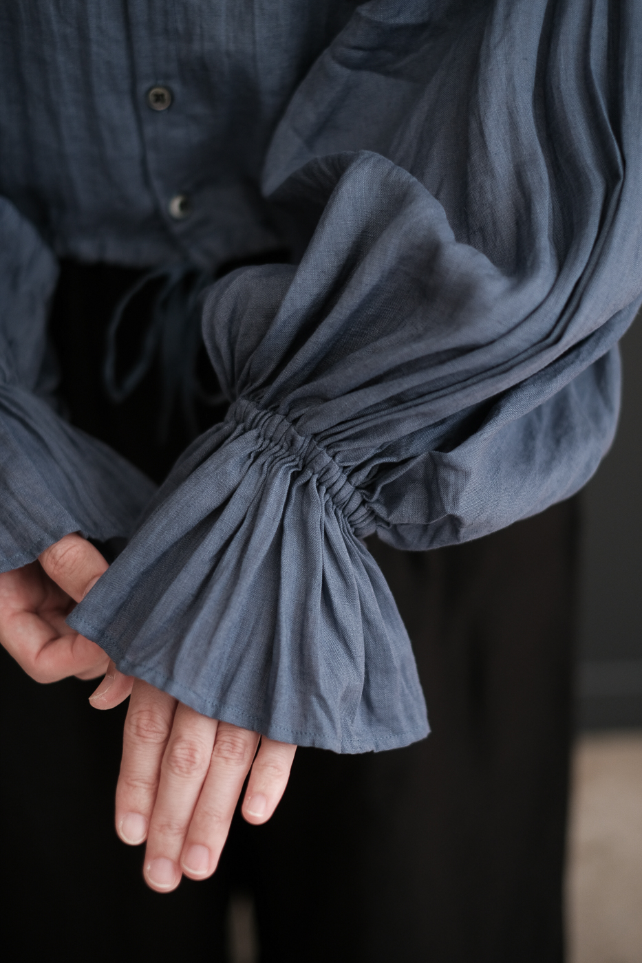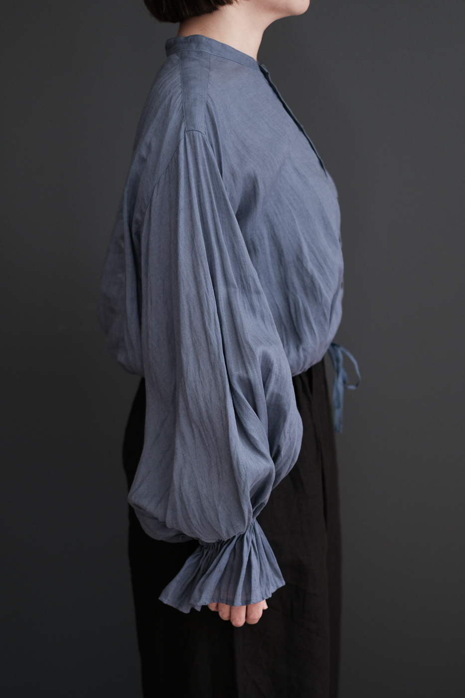 肘まで上げて袖の膨らみを強めて