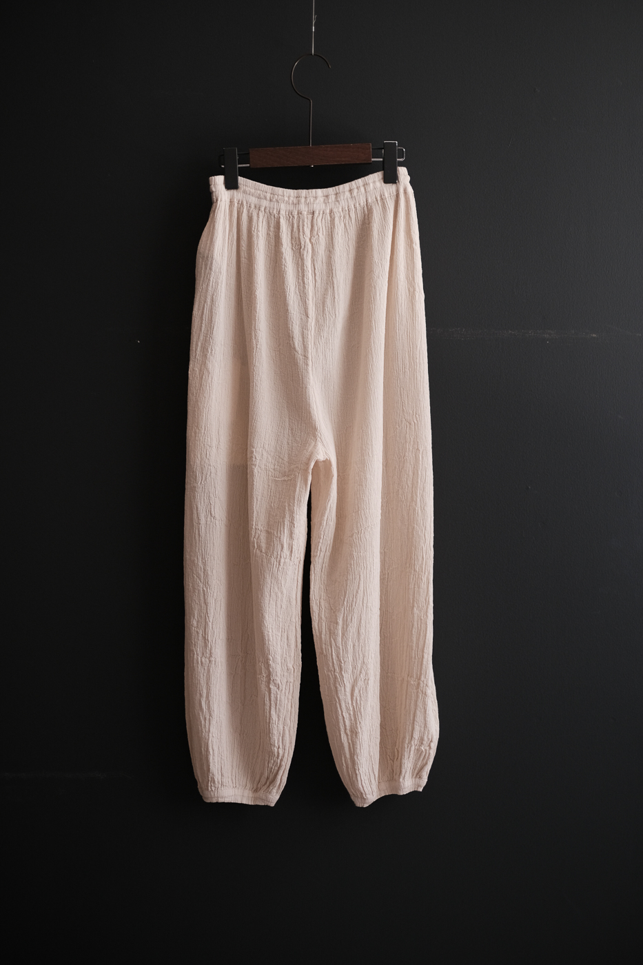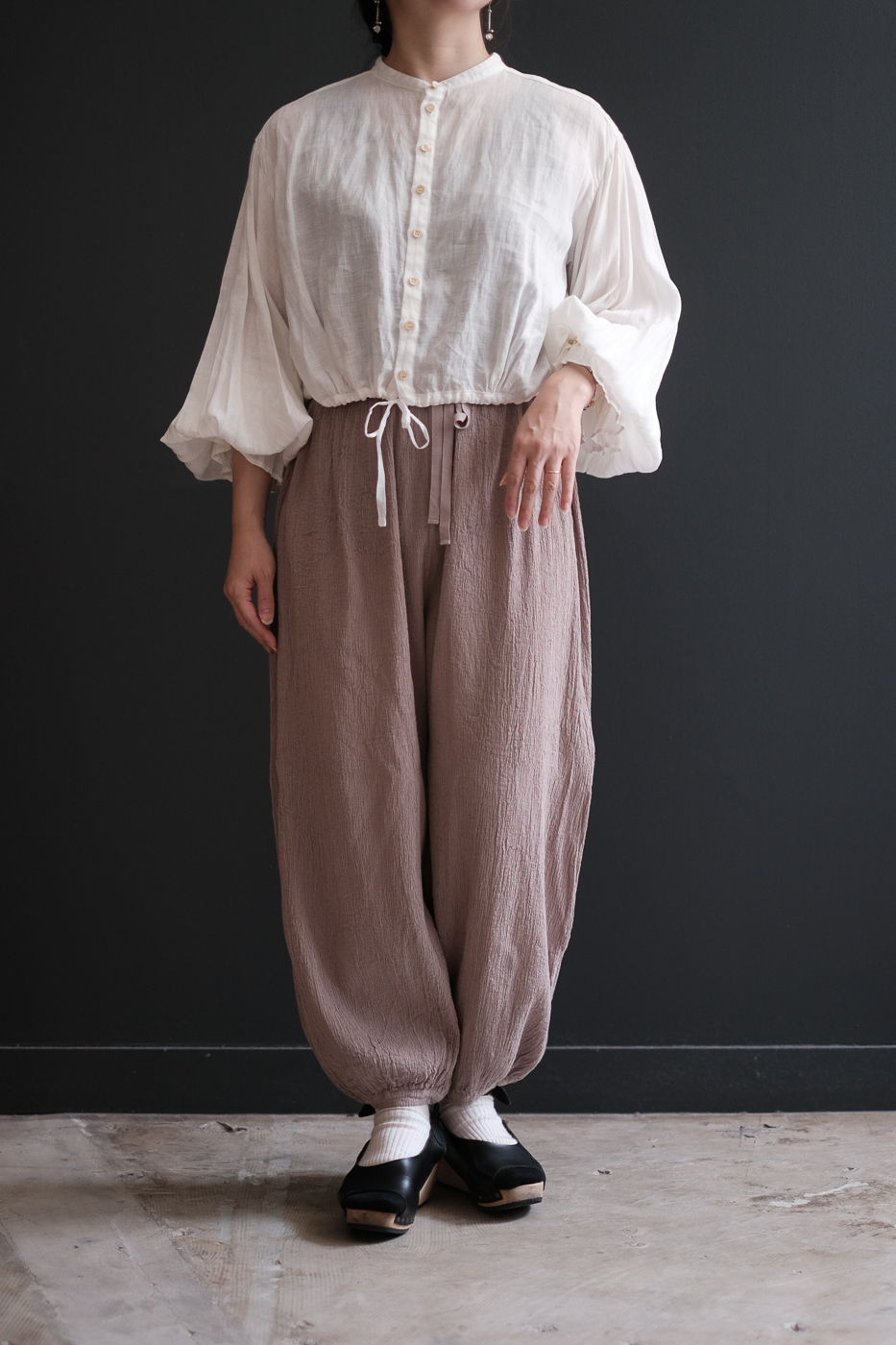 裾に膨らみのあるギャザーパンツ。