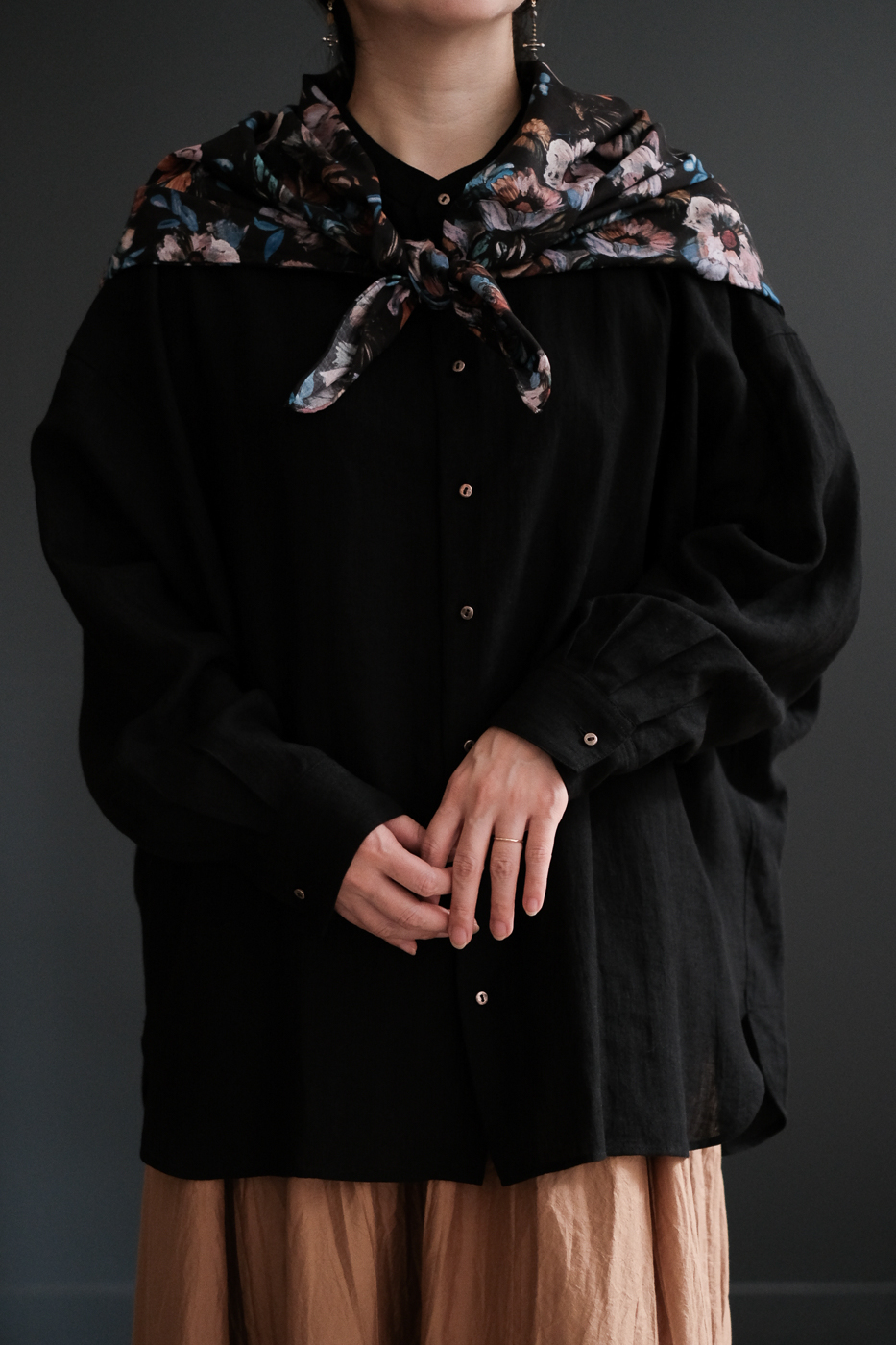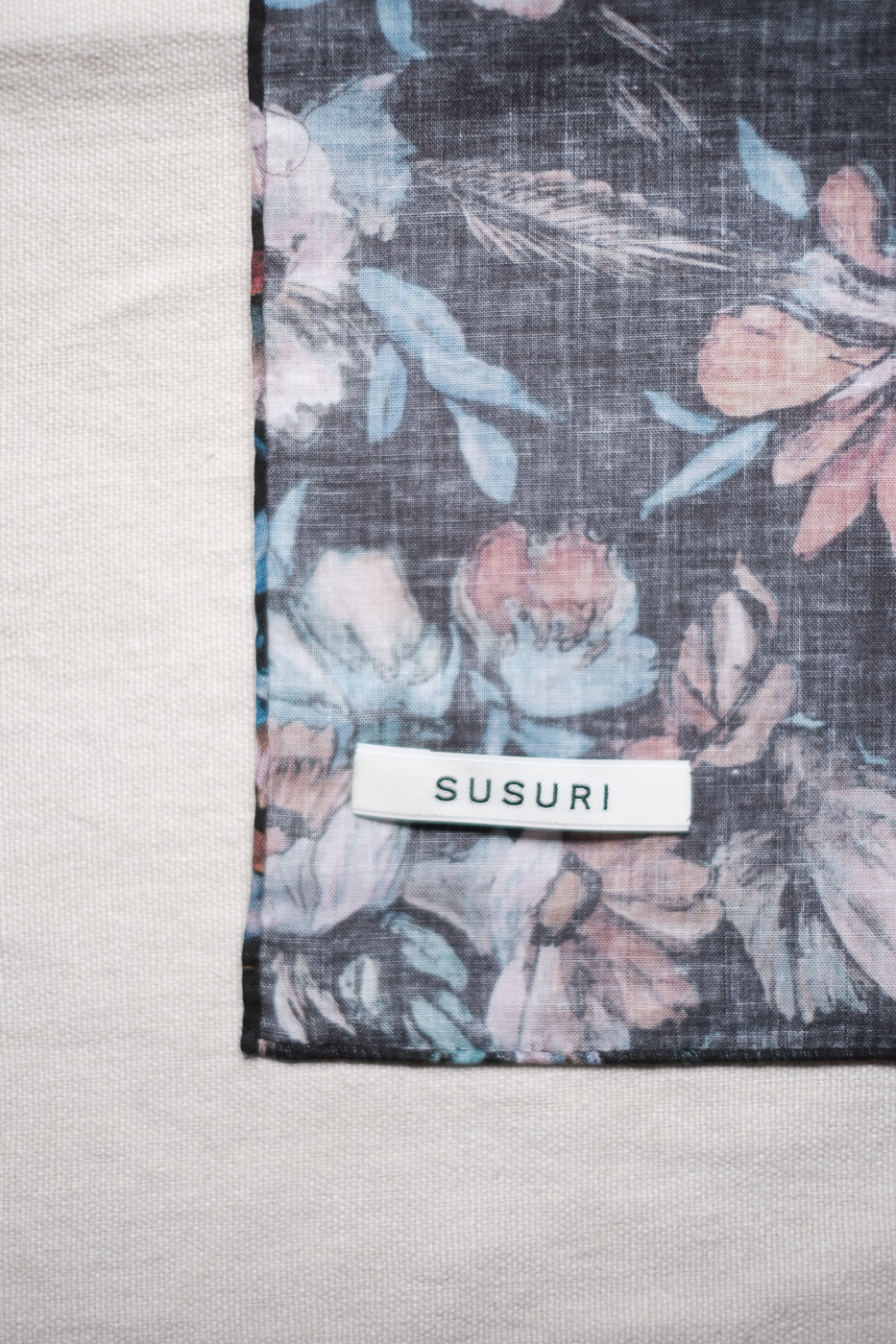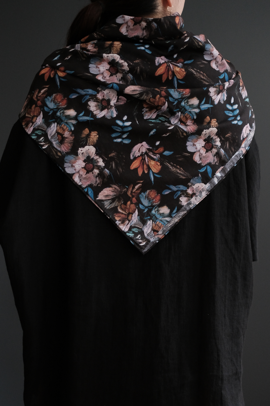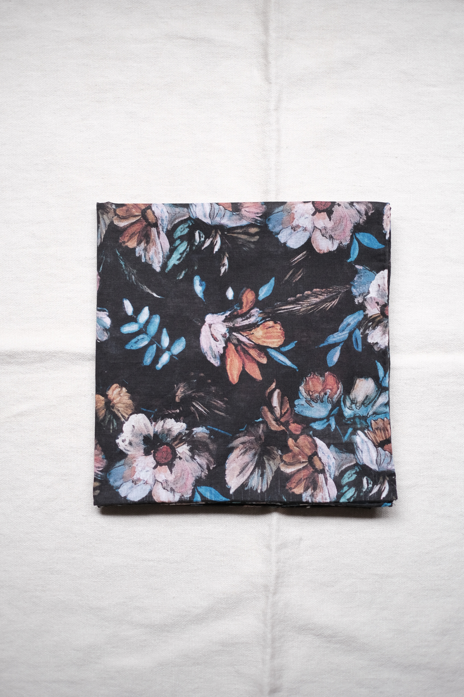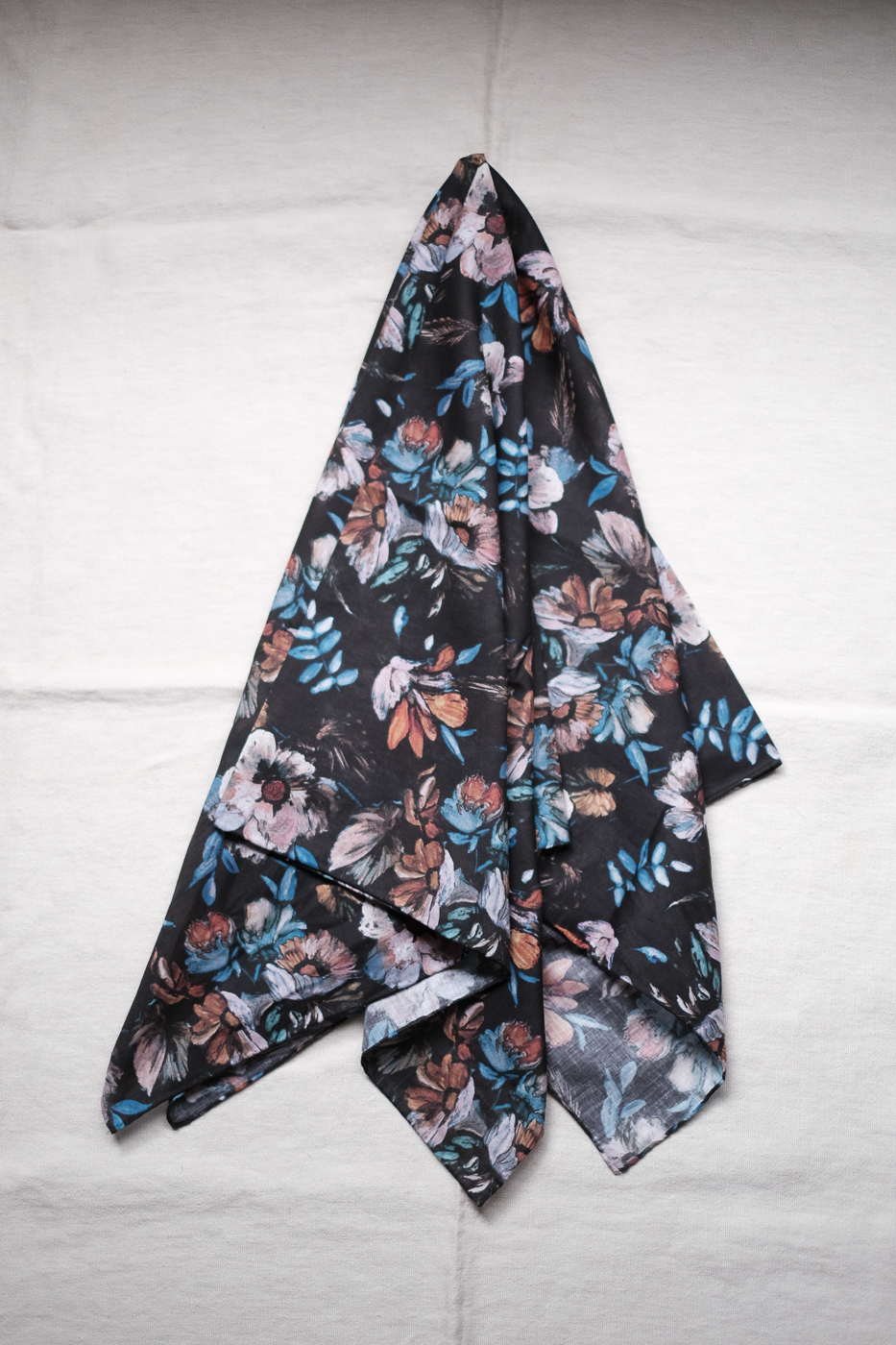 美しい花柄が一面に広がるやや大判のスカーフ。