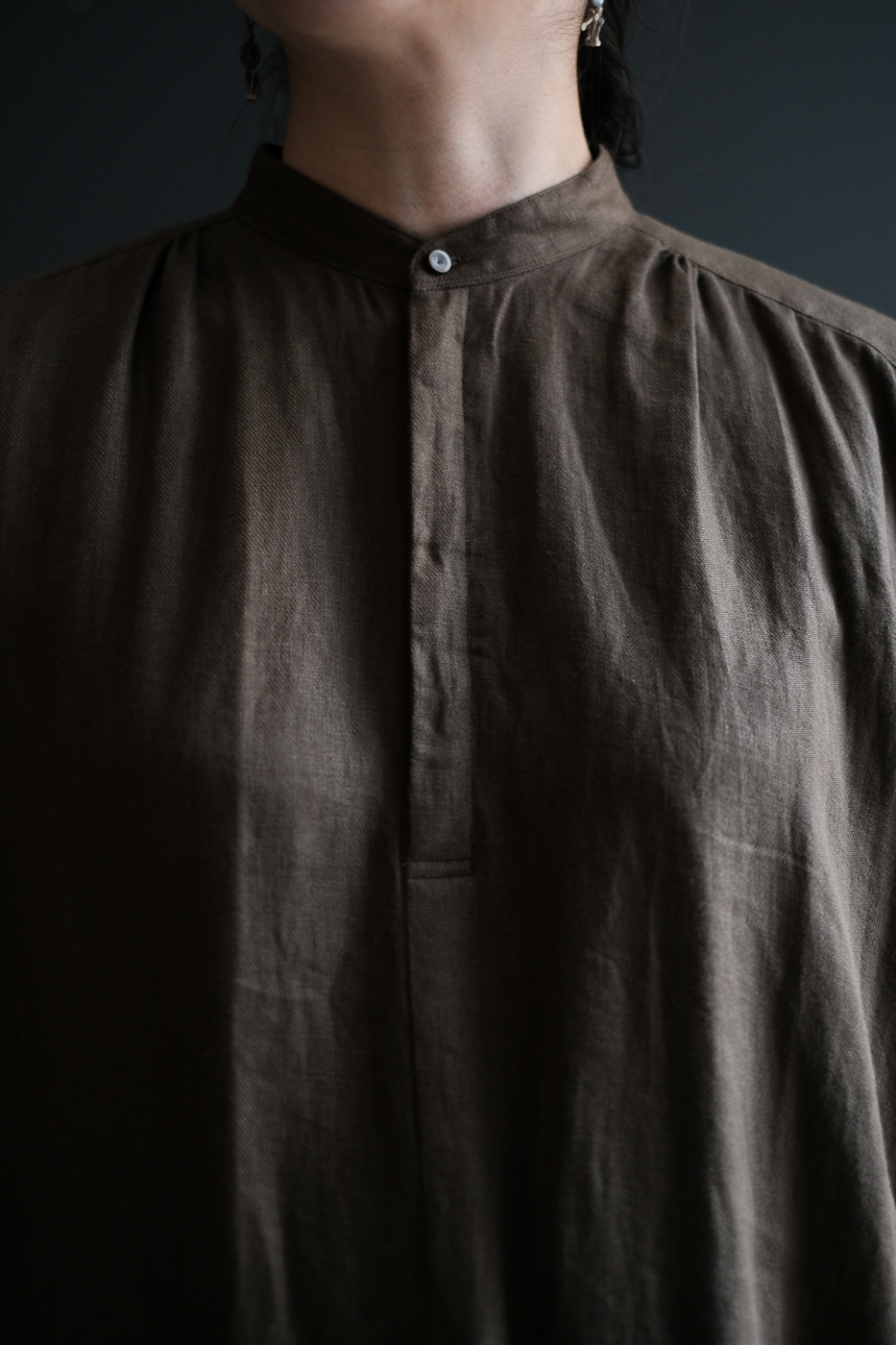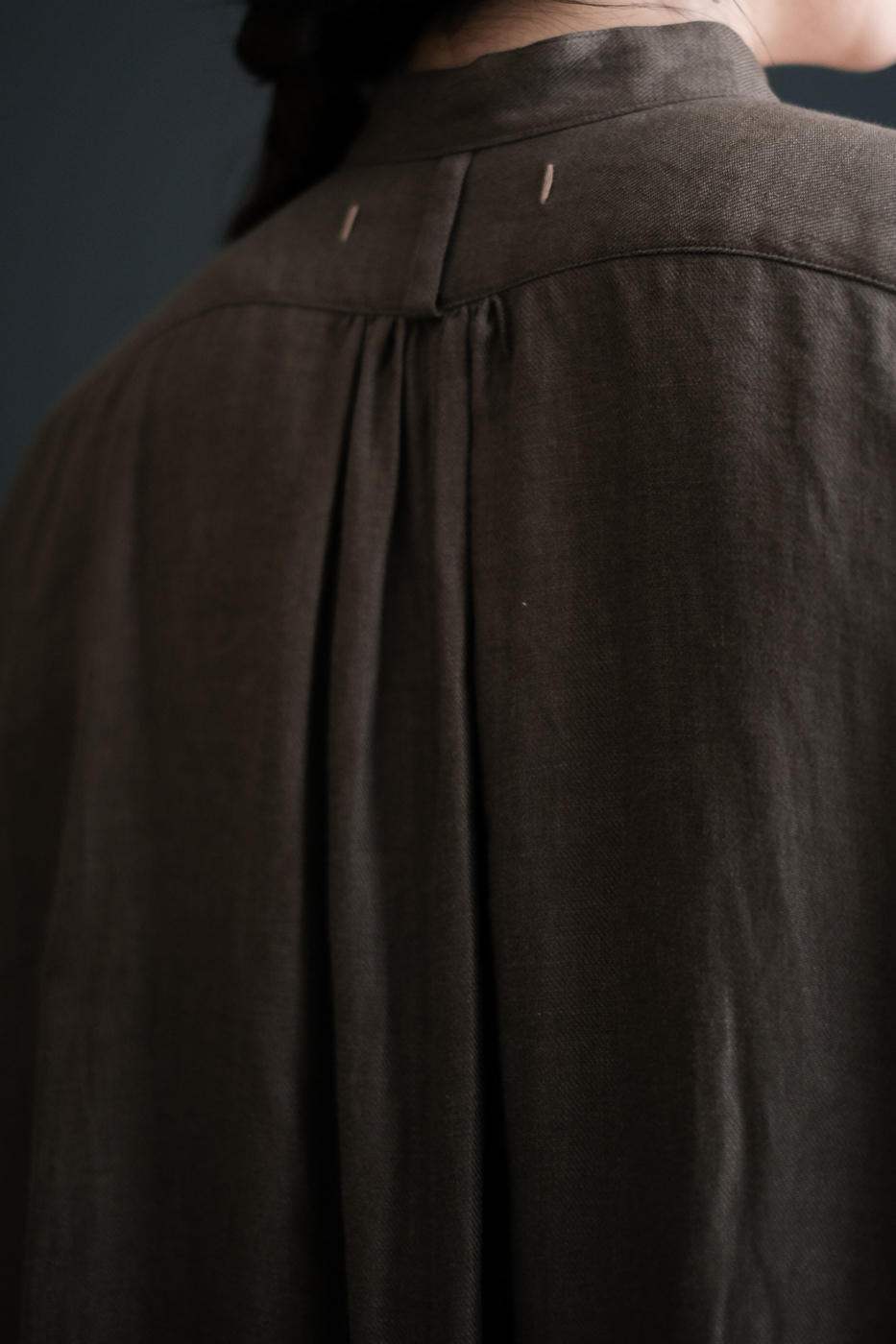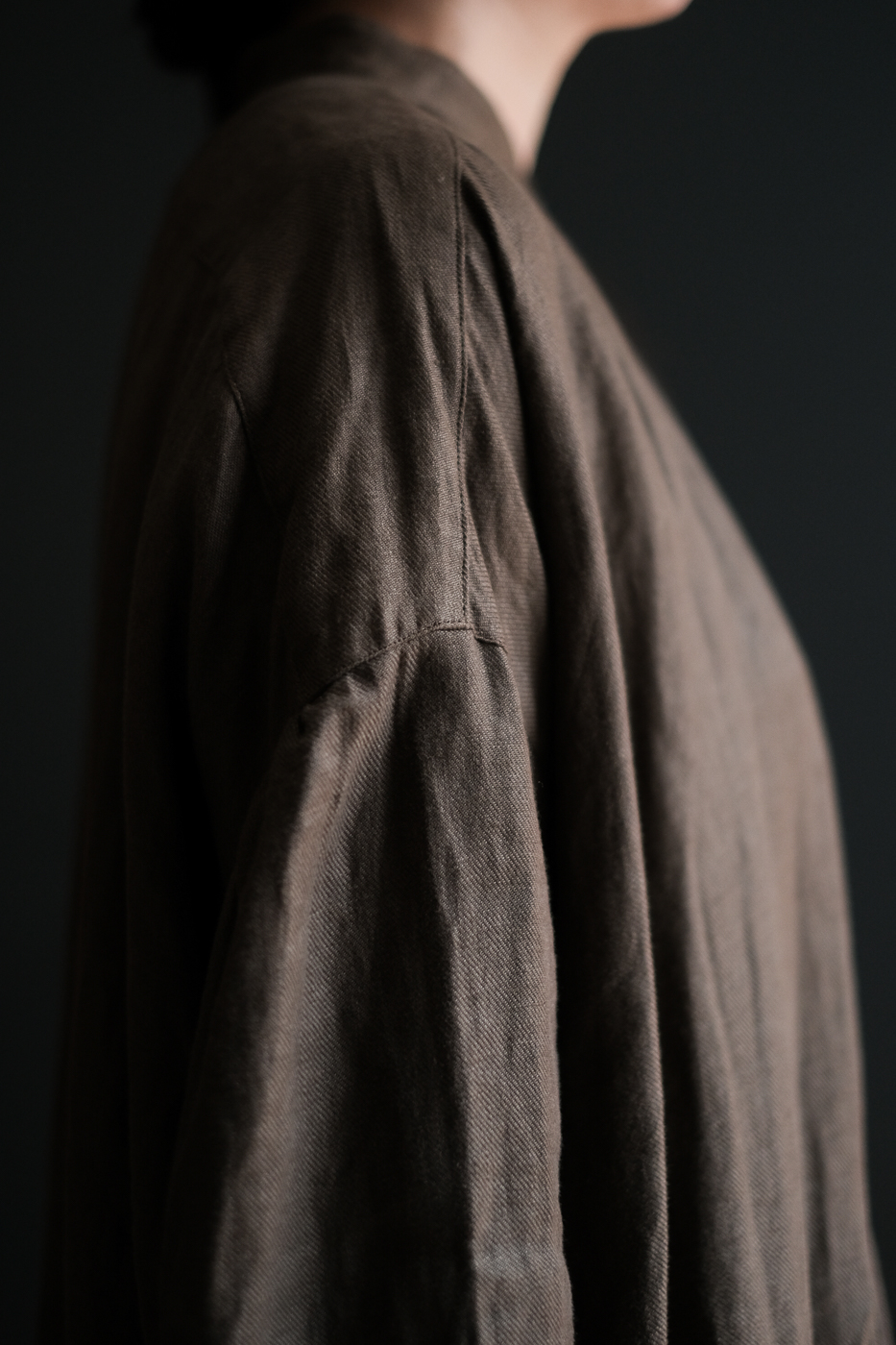 ノーカラーの首元に、前後差のある着丈、