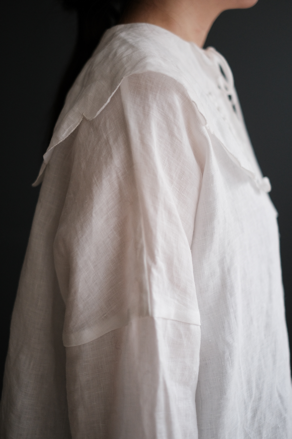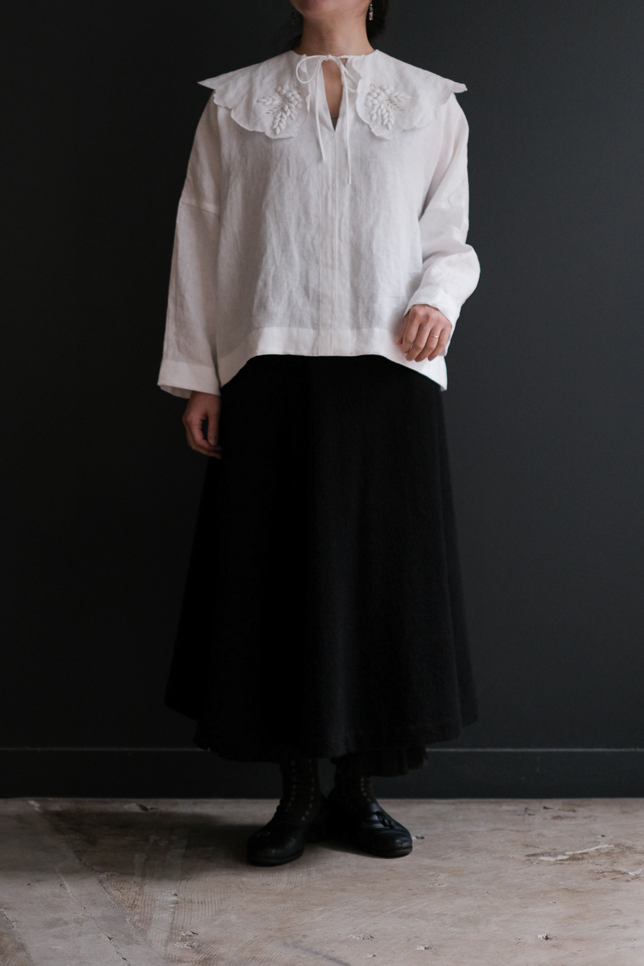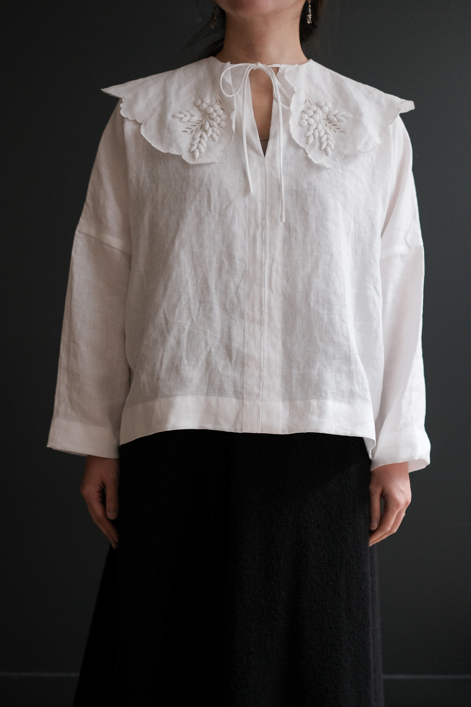 花弁のような大きな襟に施されているのは