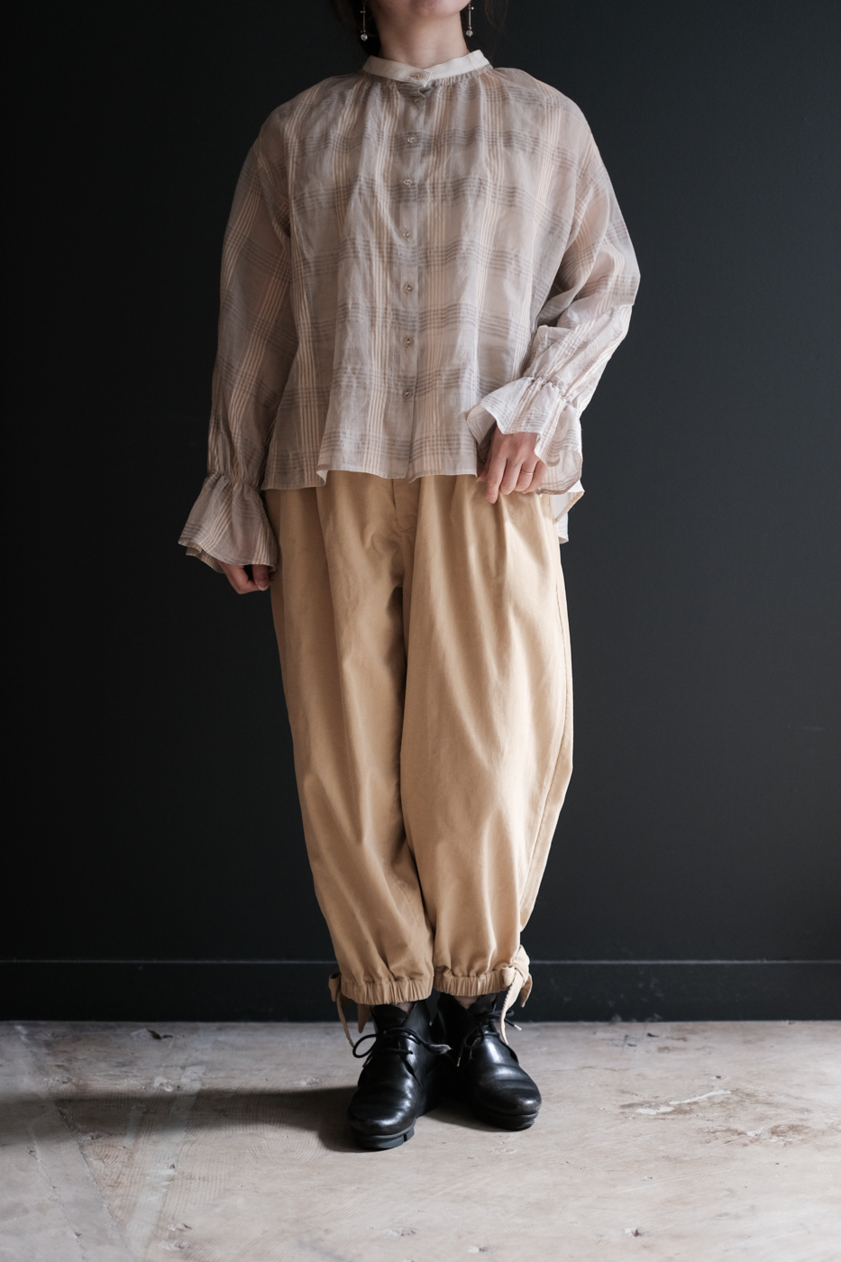 張りを抑え、ドライなタッチと立体感を持たせた生地は、