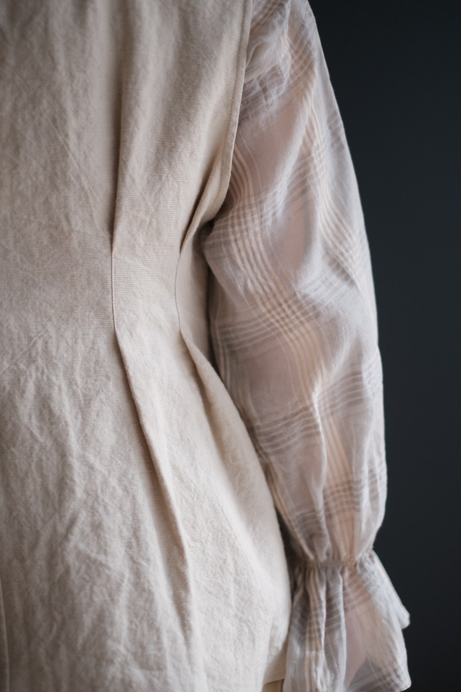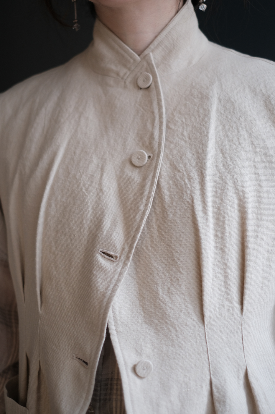 張りを抑え、ドライなタッチと立体感を持たせた生地は、